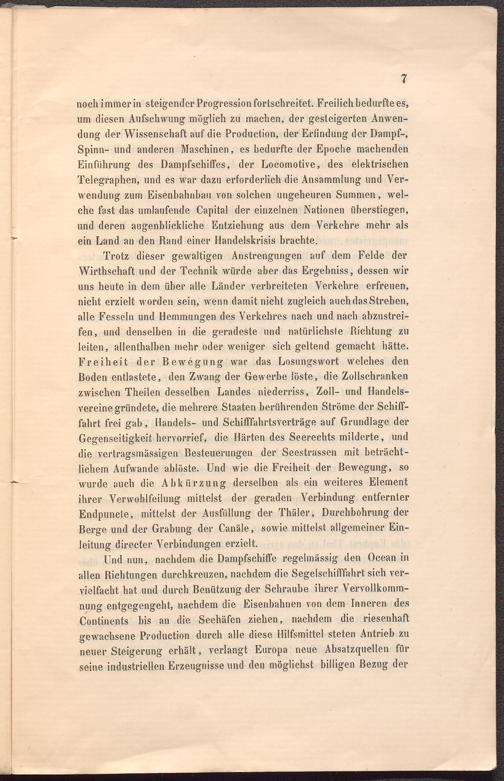 Und nun, nachdem die Dampfschiffe regelmässig den Ocean in allen Richtungen durchkreuzen, nachdem die Segelschifffahrt sich vervielfacht hat und durch Benützung der Schraube ihrer Vervollkommnung entgegengeht, nachdem die Eisenbahnen von dem Inneren des Continents bis an die Seehäfen ziehen, nachdem die riesenhaft gewachsene Production durch alle diese Hilfsmittel steten Antrieb zu