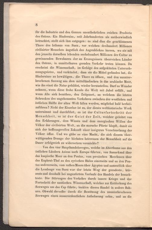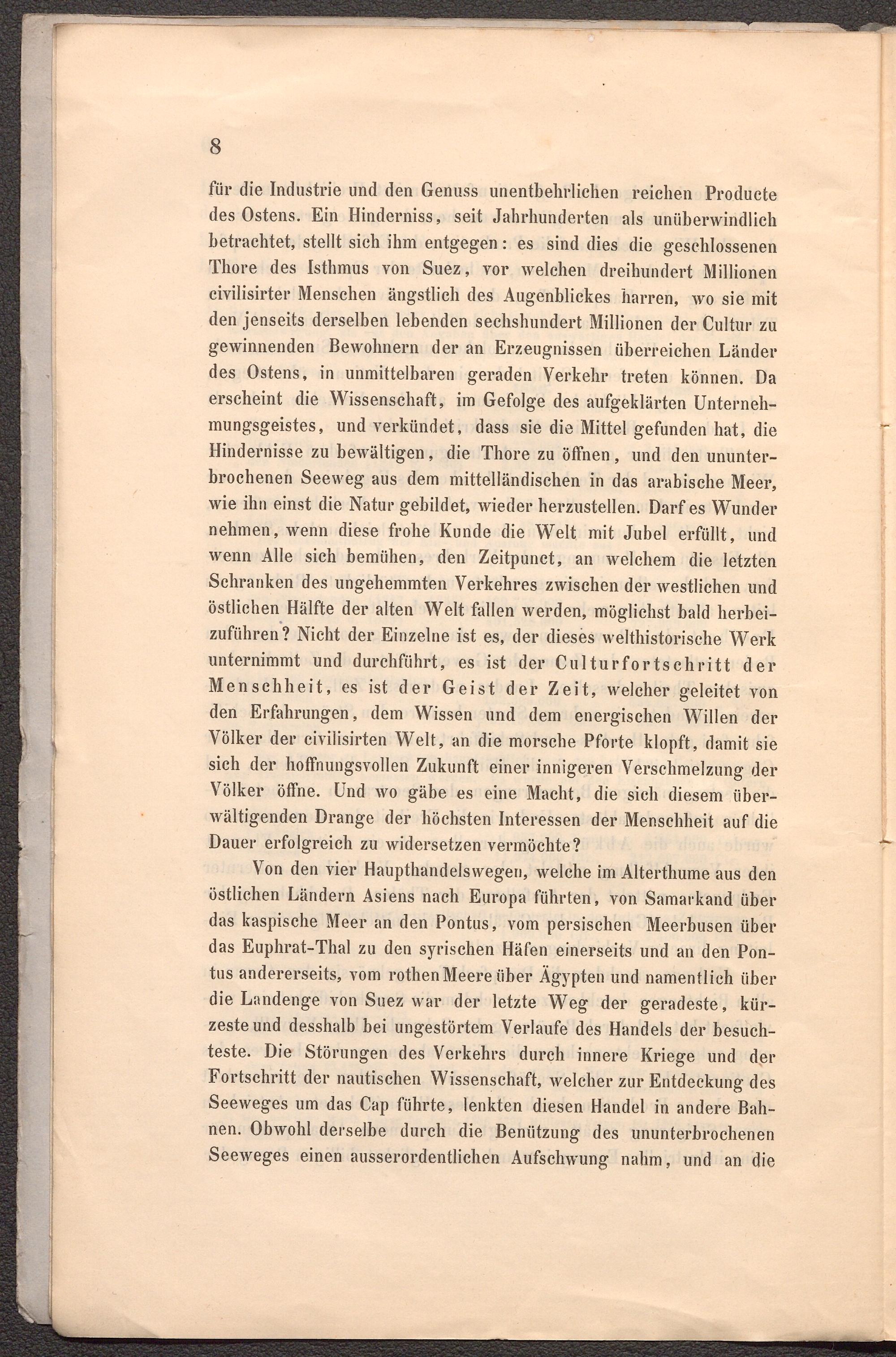 für die Industrie und den Genuss unentbehrlichen reichen Producte des Ostens. Ein Hinderniss, seit Jahrhunderten als unüberwindlich betrachtet, stellt sich ihm entgegen: es sind dies die geschlossenen Thore des Isthmus von Suez, vor welchen dreihundert Millionen civilisirter Menschen ängstlich des Augenblickes harren, wo sie mit den jenseits derselben lebenden sechshundert Millionen der Cultur zu gewinnenden Bewohnern der an Erzeugnissen überreichen Länder des Ostens, in unmittelbaren geraden Verkehr treten können. Da erscheint die Wissenschaft, im Gefolge des aufgeklärten Unternehmungsgeistes, und verkündet, dass sie die Mittel gefunden hat, die Hindernisse zu bewältigen, die Thore zu öffnen, und den ununterbrochenen Seeweg aus dem mittelländischen in das arabische Meer, wie ihn einst die Natur gebildet, wieder herzustellen. Darf es Wunder nehmen, wenn diese frohe Kunde die Welt mit Jubel erfüllt, und wenn Alle sich bemühen, den Zeitpunct, an welchem die letzten Schranken des ungehemmten Verkehres zwischen der westlichen und östlichen Hälfte der alten Welt fallen werden, möglichst bald herbeizuführen? Nicht der Einzelne ist es, der dieses welthistorische Werk unternimmt und durchführt, es ist der Culturfortschritt der Menschheit, es ist der Geist der Zeit, welcher geleitet von den Erfahrungen, dem Wissen und dem energischen Willen der Völker der civilisirten Welt, an die morsche Pforte klopft, damit sie sich der hoffnungsvollen Zukunft einer innigeren Verschmelzung der Völker öffne. Und wo gäbe es eine Macht, die sich diesem überwältigenden Drange der höchsten Interessen der Menschheit auf die Dauer erfolgreich zu widersetzen vermöchte?