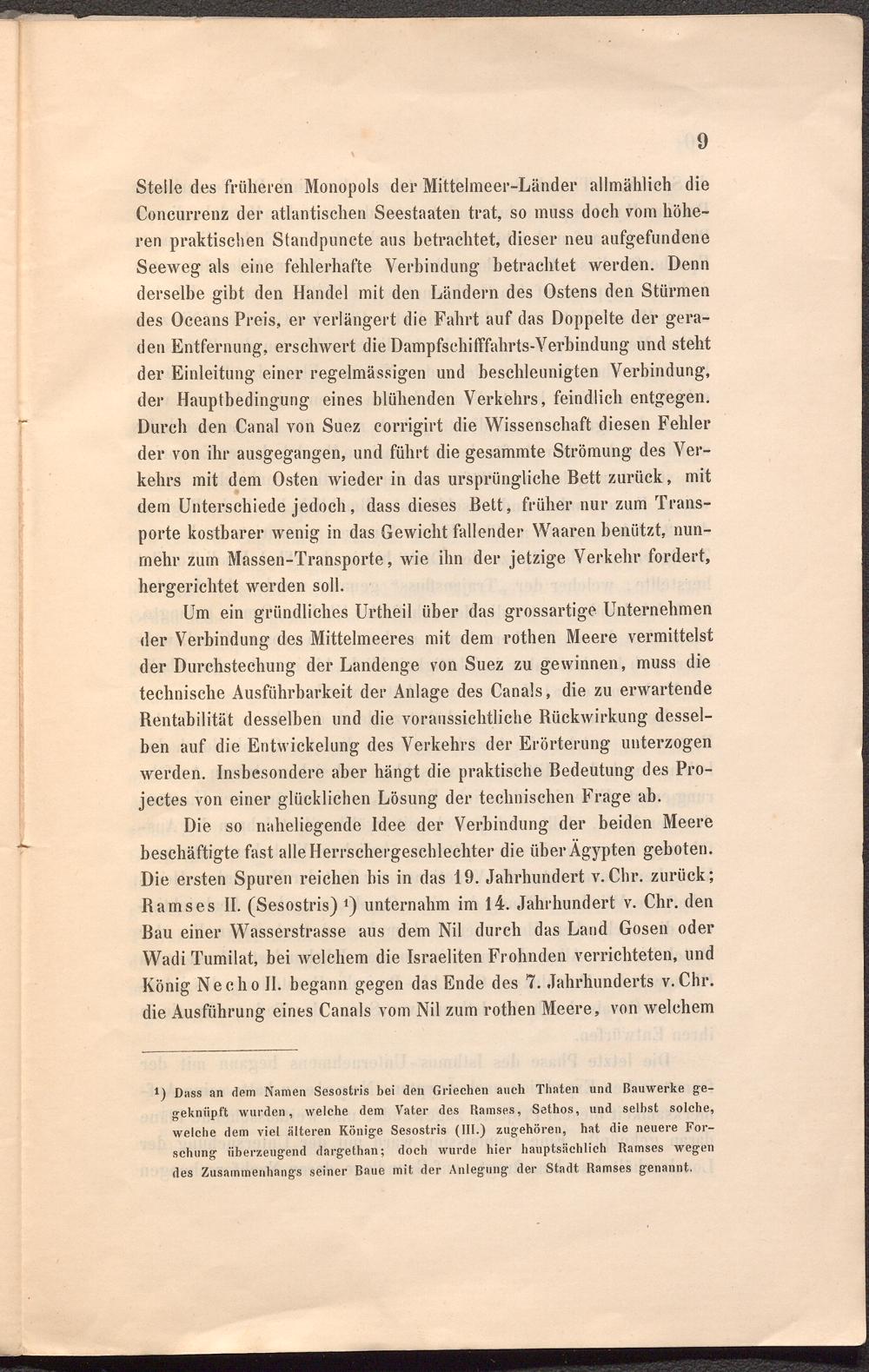 Die so naheliegende Idee der Verbindung der beiden Meere beschäftigte fast alle Herrschergeschlechter die über Ägypten geboten. Die ersten Spuren reichen bis in das 19. Jahrhundert v.Chr. zurück; Bamses II. (Sesostris) *) unternahm im 14. Jahrhundert v. Chr. den Bau einer Wasserstrasse aus dem Nil durch das Land Gosen oder Wadi Tumilat, bei welchem die Israeliten Frohnden verrichteten, und König Necho II. begann gegen das Ende des 7. Jahrhunderts v.Chr. die Ausführung eines Canals vom Nil zum rothen Meere, von welchem