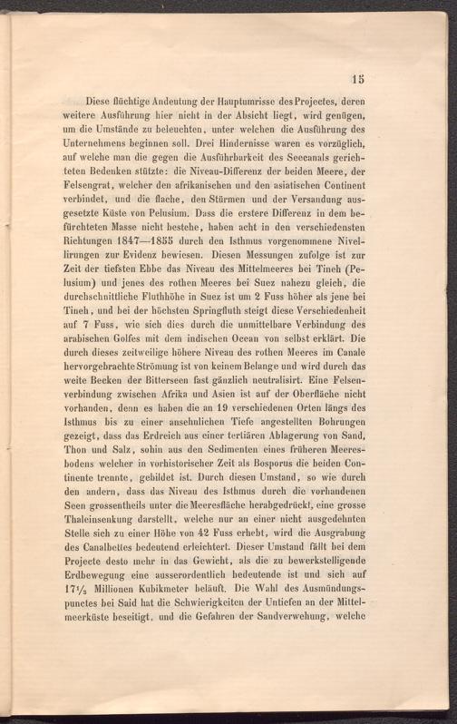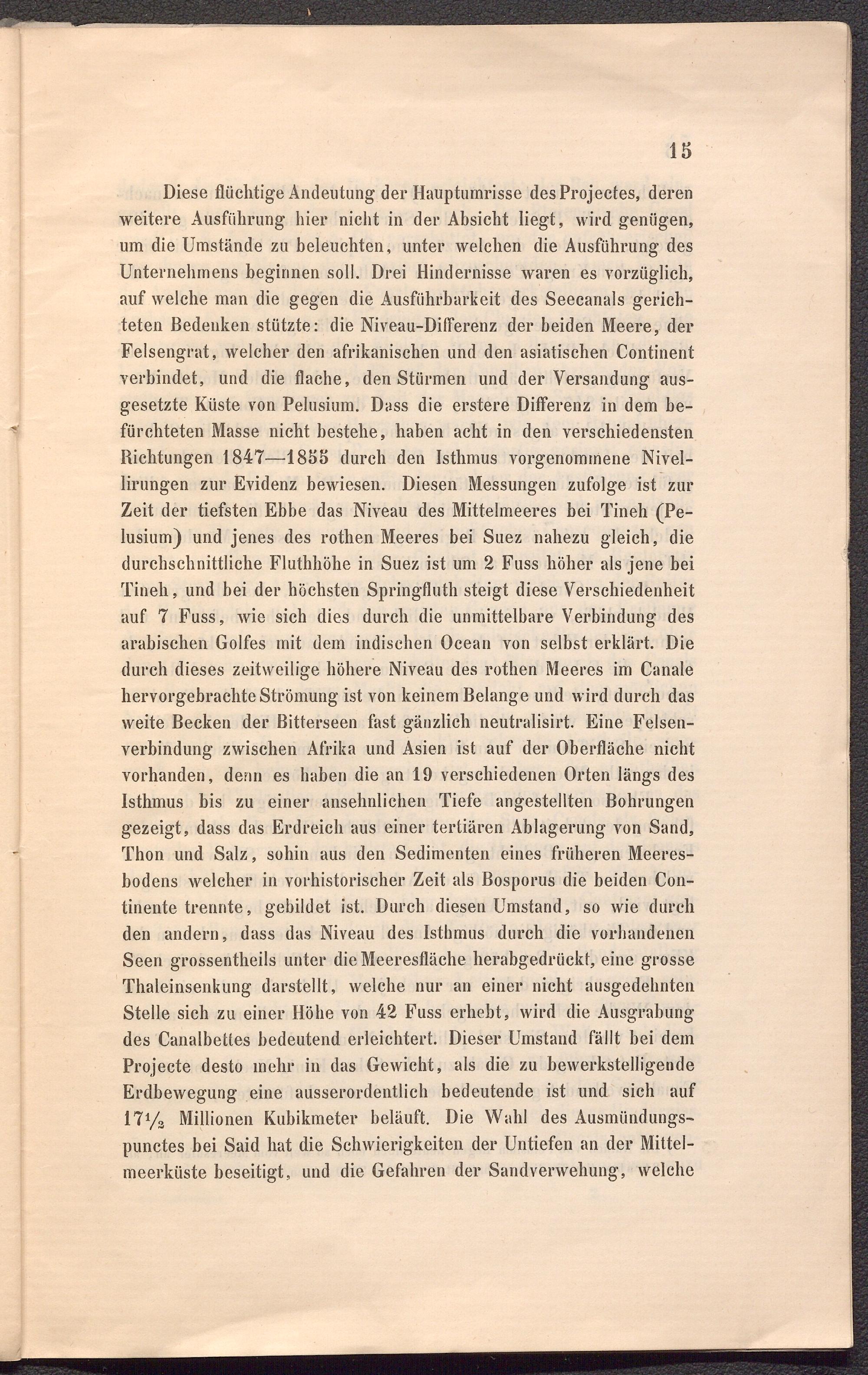 Diese flüchtige Andeutung der Hauptumrisse desProjectes, deren weitere Ausführung hier nicht in der Absicht liegt, wird genügen, um die Umstände zu beleuchten, unter welchen die Ausführung des Unternehmens beginnen soll. Drei Hindernisse waren es vorzüglich, auf welche man die gegen die Ausführbarkeit des Seecanals gerichteten Bedenken stützte: die Niveau-Differenz der beiden Meere, der Felsengrat, welcher den afrikanischen und den asiatischen Continent verbindet, und die flache, denStürmen und der Versandung ausgesetzte Küste von Pelusium. Dass die erstere Differenz in dem befürchteten Masse nicht bestehe, haben acht in den verschiedensten Richtungen 1847—18h5 durch den Isthmus vorgenommene Nivel- lirungen zur Evidenz bewiesen. Diesen Messungen zufolge ist zur Zeit der tiefsten Ebbe das Niveau des Mittelmeeres bei Tineh (Pelusium) und jenes des rothen Meeres bei Suez nahezu gleich, die durchschnittliche Fluthhöhe in Suez ist um 2 Fuss höher als jene bei Tineh, und bei der höchsten Springfluth steigt diese Verschiedenheit auf 7 Fuss, wie sich dies durch die unmittelbare Verbindung des arabischen Golfes mit dem indischen Ocean von selbst erklärt. Die durch dieses zeitweilige höhere Niveau des rothen Meeres im Canale hervorgebrachte Strömung ist von keinem Belange und wird durch das weite Becken der Bitterseen fast gänzlich neutralisirt. Eine Felsenverbindung zwischen Afrika und Asien ist auf der Oberfläche nicht vorhanden, denn es haben die an 19 verschiedenen Orten längs des Isthmus bis zu einer ansehnlichen Tiefe angestellten Bohrungen gezeigt, dass das Erdreich aus einer tertiären Ablagerung von Sand, Thon und Salz, sohin aus den Sedimenten eines früheren Meeresbodens welcher in vorhistorischer Zeit als Bosporus die beiden Con- tinente trennte, gebildet ist. Durch diesen Umstand, so wie durch den andern, dass das Niveau des Isthmus durch die vorhandenen Seen grossentheils unter die Meeresfläche herabgedrückt, eine grosse Thaleinsenkung darstellt, welche nur an einer nicht ausgedehnten Stelle sich zu einer Höhe von 42 Fuss erhebt, wird die Ausgrabung des Canalbettes bedeutend erleichtert. Dieser Umstand fällt bei dem Projecte desto mehr in das Gewicht, als die zu bewerkstelligende Erdbewegung eine ausserordentlich bedeutende ist und sich auf 17% Millionen Kubikmeter beläuft. Die Wahl des Ausmündungs- punctes bei Said hat die Schwierigkeiten der Untiefen an der Mittelmeerküste beseitigt, und die Gefahren der Sandverwehung, welche