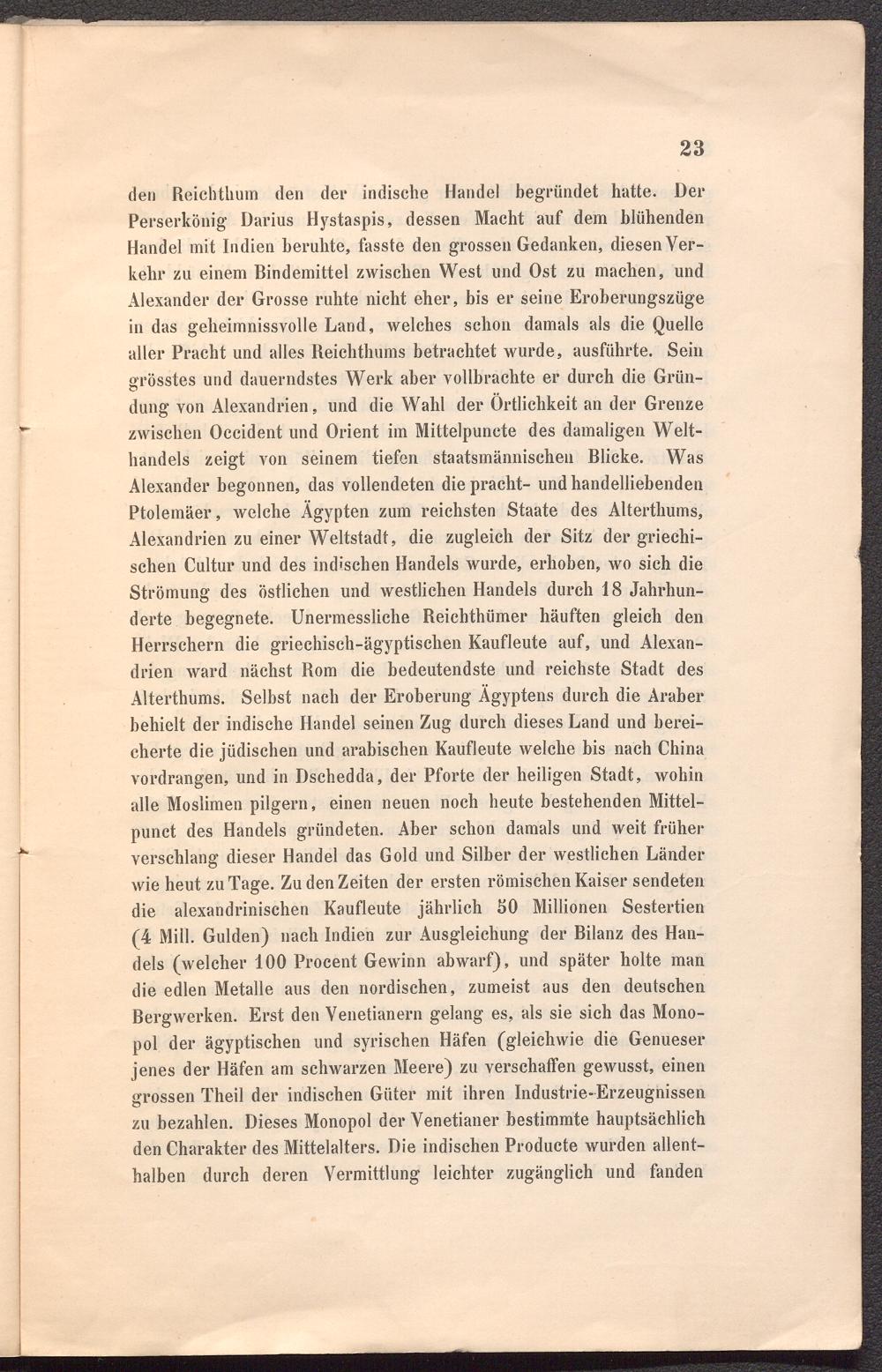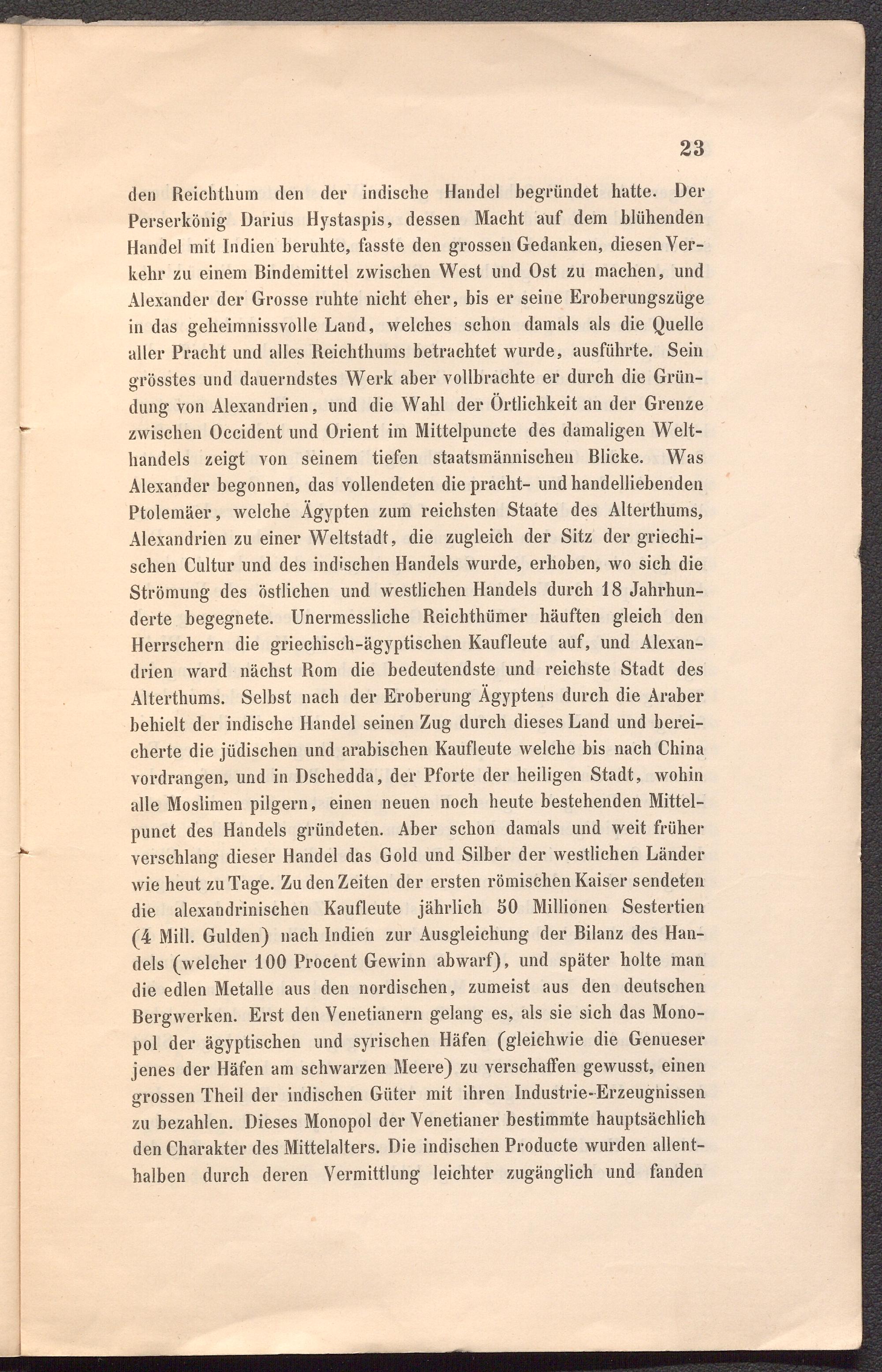 den Reichthum den der indische Handel begründet hatte. Der Perserkönig Darius Hystaspis, dessen Macht auf dem blühenden Handel mit Indien beruhte, fasste den grossen Gedanken, diesen Verkehr zu einem Bindemittel zwischen West und Ost zu machen, und Alexander der Grosse ruhte nicht eher, bis er seine Eroberungszüge in das geheimnissvolle Land, welches schon damals als die Quelle aller Pracht und alles Reichthums betrachtet wurde, ausführte. Sein grösstes und dauerndstes Werk aber vollbrachte er durch die Gründung von Alexandrien, und die Wahl der Örtlichkeit an der Grenze zwischen Occident und Orient im Mittelpunete des damaligen Welthandels zeigt von seinem tiefen staatsmännischeu Blicke. Was Alexander begonnen, das vollendeten die pracht- und handelliebenden Ptolemäer, welche Ägypten zum reichsten Staate des Alterthums, Alexandrien zu einer Weltstadt, die zugleich der Sitz der griechischen Cultur und des indischen Handels wurde, erhoben, wo sich die Strömung des östlichen und westlichen Handels durch 18 Jahrhunderte begegnete. Unermessliche Reicbthümer häuften gleich den Herrschern die griechisch-ägyptischen Kaufleute auf, und Alexandrien ward nächst Rom die bedeutendste und reichste Stadt des Alterthums. Selbst nach der Eroberung Ägyptens durch die Araber behielt der indische Handel seinen Zug durch dieses Land und bereicherte die jüdischen und arabischen Kaufleute welche bis nach China vordrangen, und in Dschedda, der Pforte der heiligen Stadt, wohin alle Moslimen pilgern, einen neuen noch heute bestehenden Mittel- punct des Handels gründeten. Aber schon damals und weit früher verschlang dieser Handel das Gold und Silber der westlichen Länder wie heut zu Tage. Zu den Zeiten der ersten römischen Kaiser sendeten die alexandrinischen Kaufleute jährlich SO Millionen Sestertien (4 Mill. Gulden) nach Indien zur Ausgleichung der Bilanz des Handels (welcher 100 Procent Gewinn abwarf), und später holte man die edlen Metalle aus den nordischen, zumeist aus den deutschen Bergwerken. Erst den Venetianern gelang es, als sie sich das Monopol der ägyptischen und syrischen Häfen (gleichwie die Genueser jenes der Häfen am schwarzen Meere) zu verschaffen gewusst, einen grossen Theil der indischen Güter mit ihren Industrie-Erzeugnissen zu bezahlen. Dieses Monopol der Venetianer bestimmte hauptsächlich den Charakter des Mittelalters. Die indischen Producte wurden allenthalben durch deren Vermittlung leichter zugänglich und fanden