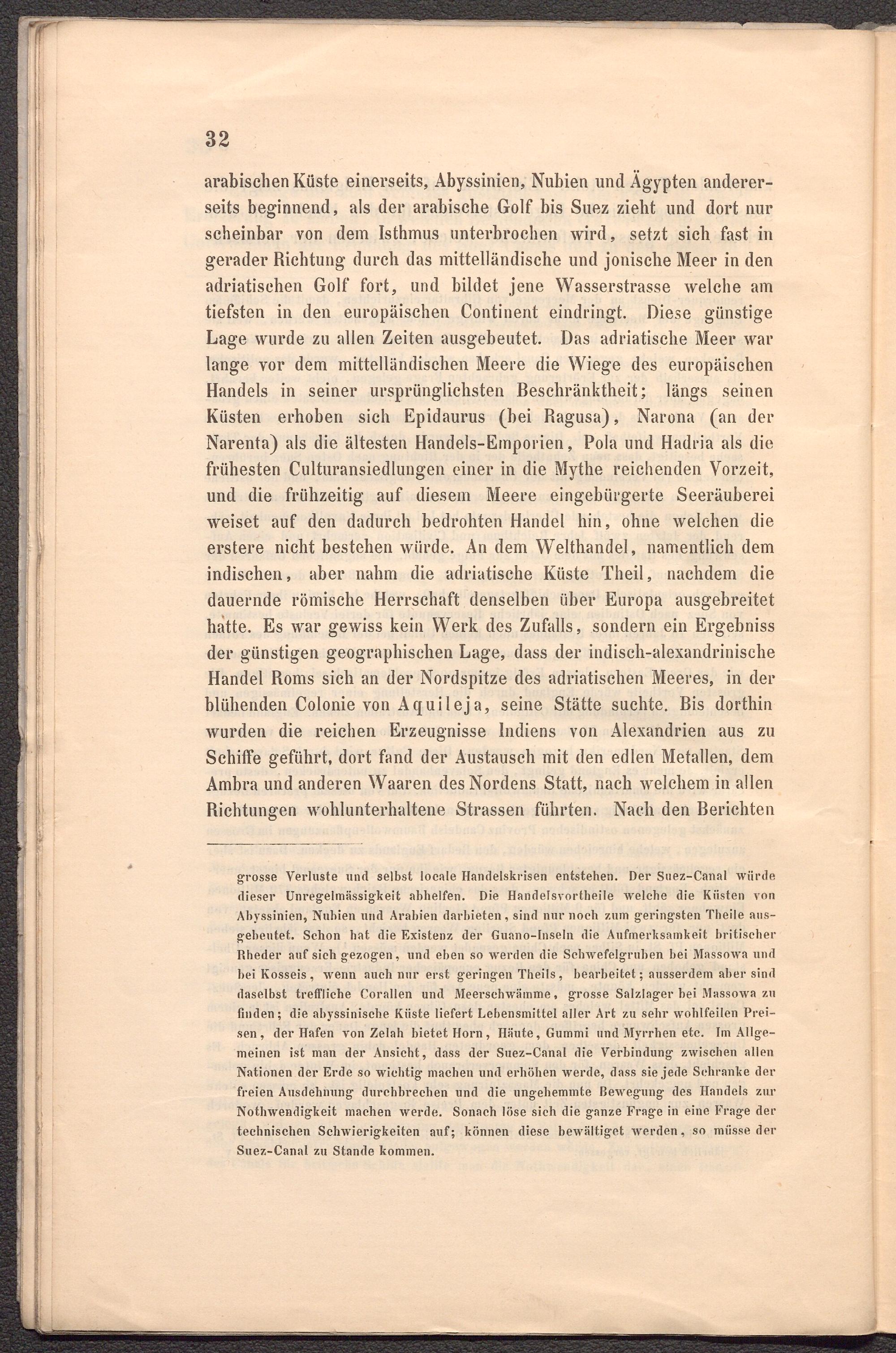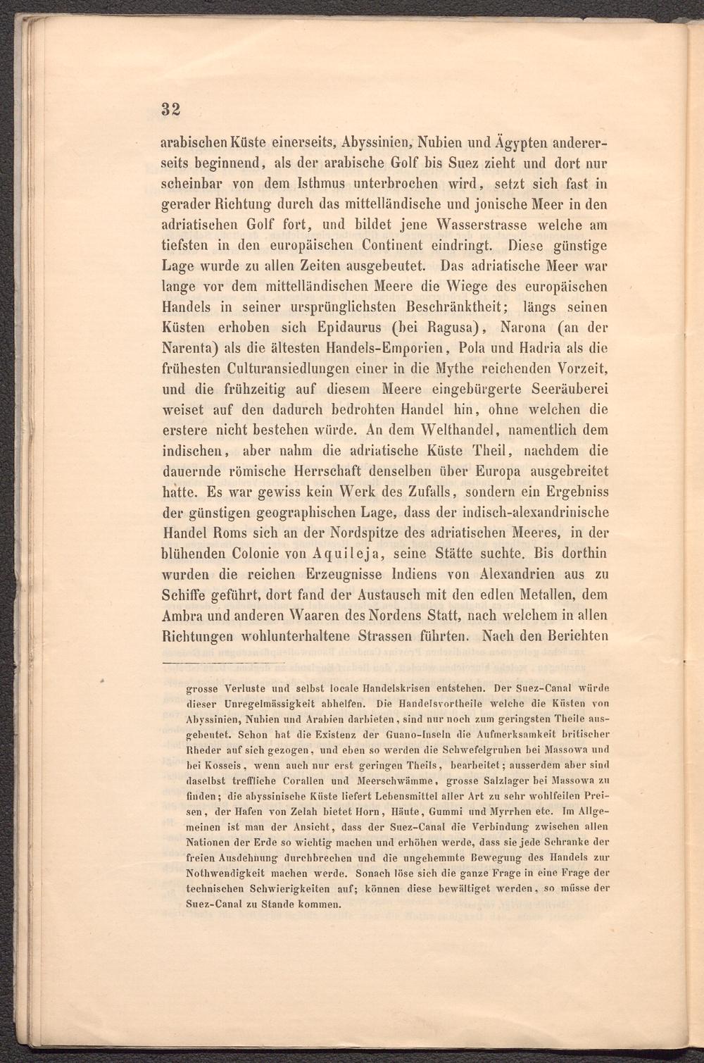 arabischen Küste einerseits, Abyssinien, Nubien und Ägypten andererseits beginnend, als der arabische Golf bis Suez zieht und dort nur scheinbar von dem Isthmus unterbrochen wird, setzt sich fast in gerader Richtung durch das mittelländische und jonische Meer in den adriatischen Golf fort, und bildet jene Wasserstrasse welche am tiefsten in den europäischen Continent eindringt. Diese günstige Lage wurde zu allen Zeiten ausgebeutet. Das adriatische Meer war lange vor dem mittelländischen Meere die Wiege des europäischen Handels in seiner ursprünglichsten Beschränktheit; längs seinen Küsten erhoben sich Epidaurus (bei Ragusa), Narona (an der Narenta) als die ältesten Handels-Emporien, Pola und Hadria als die frühesten Culturansiedlungen einer in die Mythe reichenden Vorzeit, und die frühzeitig auf diesem Meere eingebürgerte Seeräuberei weiset auf den dadurch bedrohten Handel hin, ohne welchen die erstere nicht bestehen würde. An dem Welthandel, namentlich dem indischen, aber nahm die adriatische Küste Theil, nachdem die dauernde römische Herrschaft denselben über Europa ausgebreitet hatte. Es war gewiss kein Werk des Zufalls, sondern ein Ergebniss der günstigen geographischen Lage, dass der indisch-alexandrinische Handel Roms sich an der Nordspitze des adriatischen Meeres, in der blühenden Colonie von Aquileja, seine Stätte suchte. Bis dorthin Avurden die reichen Erzeugnisse Indiens von Alexandrien aus zu Schiffe geführt, dort fand der Austausch mit den edlen Metallen, dem Ambra und anderen Waaren des Nordens Statt, nach welchem in allen Richtungen wohlunterhaltene Strassen führten. Nach den Berichten