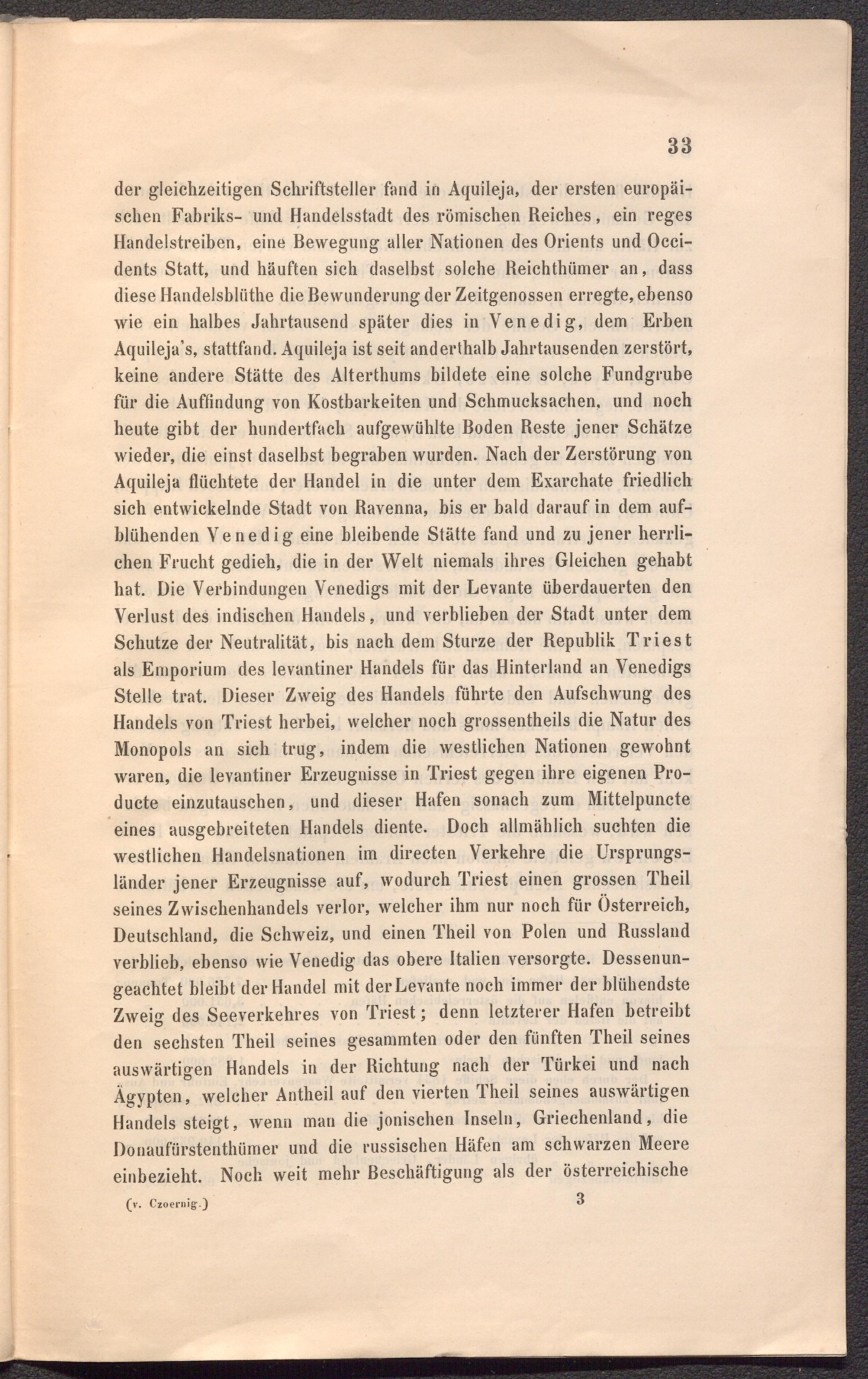 der gleichzeitigen Schriftsteller fand in Aquileja, der ersten europäischen Fabriks- und Handelsstadt des römischen Reiches, ein reges Handelstreiben, eine Bewegung aller Nationen des Orients und Occi- dents Statt, und häuften sich daselbst solche Reichthümer an, dass diese Handelsbliithe die Bewunderung der Zeitgenossen erregte, ebenso wie ein halbes Jahrtausend später dies in Venedig, dem Erben Aquileja’s, stattfand. Aquileja ist seit anderthalb Jahrtausenden zerstört, keine andere Stätte des Alterthums bildete eine solche Fundgrube für die Auffindung von Kostbarkeiten und Schmucksachen, und noch heute gibt der hundertfach aufgewühlte Boden Reste jener Schätze wieder, die einst daselbst begraben wurden. Nach der Zerstörung von Aquileja flüchtete der Handel in die unter dem Exarchate friedlich sich entwickelnde Stadt von Ravenna, bis er bald darauf in dem aufblühenden Venedig eine bleibende Stätte fand und zu jener herrlichen Frucht gedieh, die in der Welt niemals ihres Gleichen gehabt hat. Die Verbindungen Venedigs mit der Levante überdauerten den Verlust des indischen Handels, und verblieben der Stadt unter dem Schutze der Neutralität, bis nach dem Sturze der Republik Triest als Emporium des levantiner Handels für das Hinterland an Venedigs Stelle trat. Dieser Zweig des Handels führte den Aufschwung des Handels von Triest herbei, welcher noch grossentheils die Natur des Monopols an sich trug, indem die westlichen Nationen gewohnt waren, die levantiner Erzeugnisse in Triest gegen ihre eigenen Pro- ducte einzutauschen, und dieser Hafen sonach zum Mittelpuncte eines ausgebreiteten Handels diente. Doch allmählich suchten die westlichen Handelsnationen im directen Verkehre die Ursprungsländer jener Erzeugnisse auf, wodurch Triest einen grossen Theil seines Zwischenhandels verlor, welcher ihm nur noch für Österreich, Deutschland, die Schweiz, und einen Theil von Polen und Russland verblieb, ebenso wie Venedig das obere Italien versorgte. Dessenungeachtet bleibt der Handel mit der Levante noch immer der blühendste Zweig des Seeverkehres von Triest; denn letzterer Hafen betreibt den sechsten Theil seines gesammten oder den fünften Theil seines auswärtigen Handels in der Richtung nach der Türkei und nach Ägypten, welcher Antheil auf den vierten Theil seines auswärtigen Handels steigt, wenn man die jonischen Inseln, Griechenland, die Donaufürstenthümer und die russischen Häfen am schwarzen Meere einbezieht. Noch weit mehr Beschäftigung als der österreichische