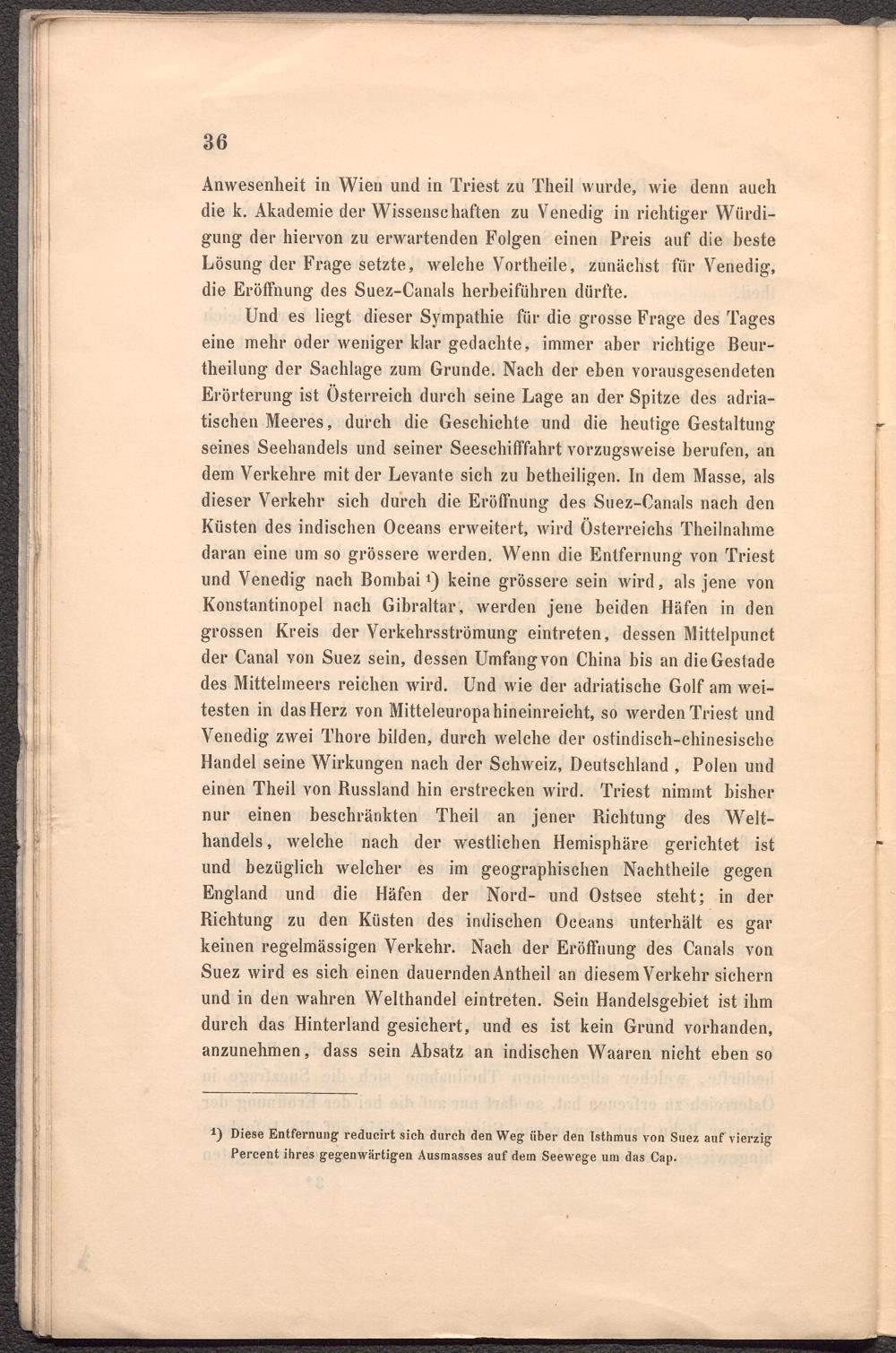 Und es liegt dieser Sympathie für die grosse Frage des Tages eine mehr oder weniger klar gedachte, immer aber richtige Beur- theilung der Sachlage zum Grunde. Nach der eben vorausgesendeten Erörterung ist Österreich durch seine Lage an der Spitze des adriatischen Meeres, durch die Geschichte und die heutige Gestaltung seines Seehandels und seiner Seeschifffahrt vorzugsweise berufen, an dem Verkehre mit der Levante sich zu betheiligen. In dem Masse, als dieser Verkehr sich durch die Eröffnung des Suez-Canals nach den Küsten des indischen Oceans erweitert, wird Österreichs Theilnahme daran eine um so grössere werden. Wenn die Entfernung von Triest und Venedig nach Bombai *) keine grössere sein wird, als jene von Konstantinopel nach Gibraltar, werden jene beiden Häfen in den grossen Kreis der Verkehrsströmung eintreten, dessen Mittelpunct der Canal von Suez sein, dessen Umfang von China bis an die Gestade des Mittelmeers reichen wird. Und wie der adriatische Golf am weitesten in das Herz von Mitteleuropa hineinreicht, so werden Triest und Venedig zwei Thore bilden, durch welche der ostindisch-chinesische Handel seine Wirkungen nach der Schweiz, Deutschland , Polen und einen Theil von Bussland hin erstrecken wird. Triest nimmt bisher nur einen beschränkten Theil an jener Richtung des Welthandels, welche nach der westlichen Hemisphäre gerichtet ist und bezüglich welcher es im geographischen Nachtheile gegen England und die Häfen der Nord- und Ostsee steht; in der Richtung zu den Küsten des indischen Oceans unterhält es gar keinen regelmässigen Verkehr. Nach der Eröffnung des Canals von Suez wird es sich einen dauernden Antheil an diesem Verkehr sichern und in den wahren Welthandel eintreten. Sein Handelsgebiet ist ihm durch das Hinterland gesichert, und es ist kein Grund vorhanden, anzunehmen, dass sein Absatz an indischen Waaren nicht eben so