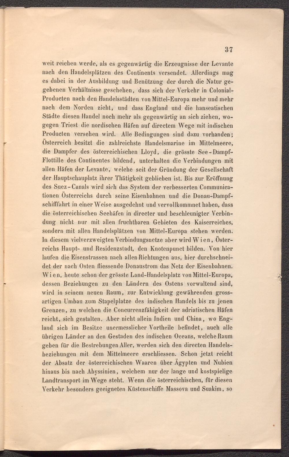 weit reichen werde, als es gegenwärtig die Erzeugnisse der Levante nach den Handelsplätzen des Coritinents versendet. Allerdings mag es dabei in der Ausbildung und Benützung der durch die Natur gegebenen Verhältnisse geschehen, dass sich der Verkehr in Colonial- Producten nach den Handelsstädten von Mittel-Europa mehr und mehr nach dem Norden zieht, und dass England und die hanseatischen Städte diesen Handel noch mehr als gegenwärtig an sich ziehen, wogegen Triest die nordischen Häfen auf directem Wege mit indischen Producten versehen wird. Alle Bedingungen sind dazu vorhanden; Österreich besitzt die zahlreichste Handelsmarine im Mittelmeere, die Dampfer des österreichischen Lloyd, die grösste See-Dampf- Flottille des Continentes bildend, unterhalten die Verbindungen mit allen Häfen der Levante, welche seit der Gründung der Gesellschaft der Hauptschauplatz ihrer Thätigkeit geblieben ist. Bis zur Eröffnung des Suez-Canals wird sieh das System der verbesserten Communica- tionen Österreichs durch seine Eisenbahnen und die Donau-Dampfschifffahrt in einerWeise ausgedehnt und vervollkommnet haben, dass die österreichischen Seehäfen in directer und beschleunigter Verbindung nicht nur mit allen fruchtbaren Gebieten des Kaiserreiches, sondern mit allen Handelsplätzen von Mittel-Europa stehen werden. In diesem vielverzweigten Verbindungsnetze aber wird Wien, Österreichs Haupt- und Besidenzstadt, den Knotenpunct bilden. Von hier laufen die Eisenstrassen nach allen Bichtungen aus, hier durchschneidet der nach Osten fliessende Donaustrom das Netz der Eisenbahnen. Wien, heute schon der grösste Land-Handelsplatz von Mittel-Europa, dessen Beziehungen zu den Ländern des Ostens vorwaltend sind, wird in seinem neuen Baum, zur Entwicklung gewährenden grossartigen Umbau zum Stapelplatze des indischen Handels bis zu jenen Grenzen, zu welchen die Concurrenzfäln'gkeit der adriatischen Häfen reicht, sich gestalten. Aber nicht allein Indien und China, wo England sich im Besitze unermesslicher Vortheile befindet, auch alle übrigen Länder an den Gestaden des indischen Oceans, welche Baum geben für die Bestrebungen Aller, werden sich den directen Handelsbeziehungen mit dem Mittelmeere erschliessen. Schon jetzt reicht der Absatz der österreichischen Waaren über Ägypten und Nubien hinaus bis nach Abyssinien, welchem nur der lange und kostspielige Landtransport im Wege steht. Wenn die österreichischen, für diesen Verkehr besonders geeigneten Küstenschiffe Massova und Suakim, so