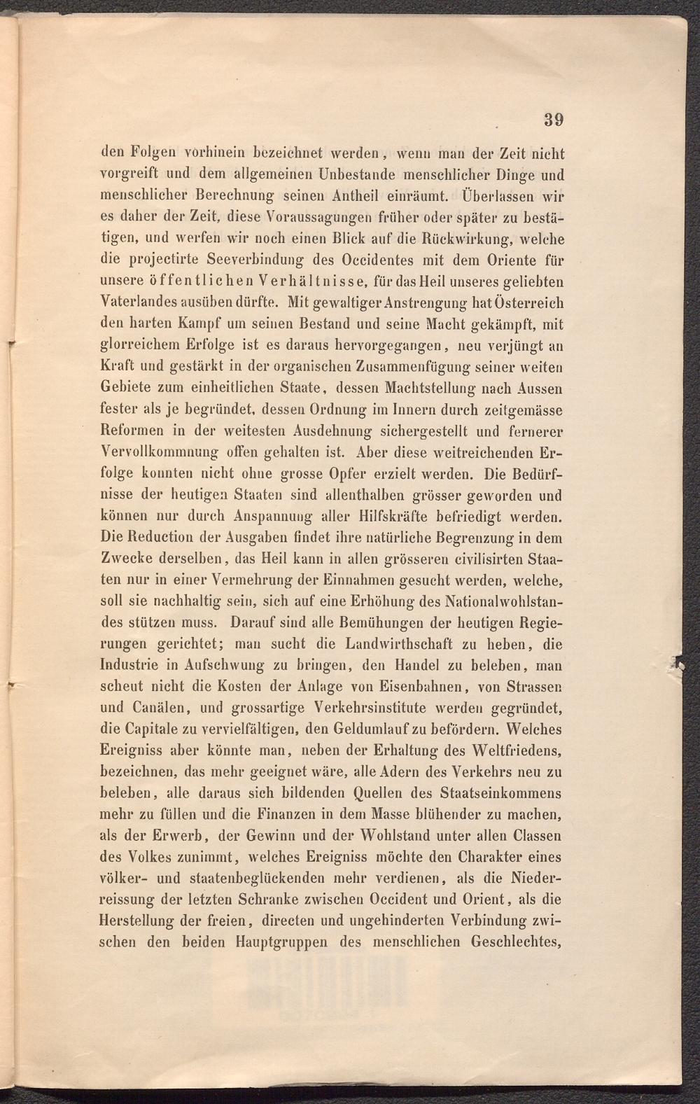 den Folgen vorhinein bezeichnet werden, wenn man der Zeit nicht vorgreift und dem allgemeinen Unbestande menschlicher Dinge und menschlicher Berechnung seinen Antheil einräumt. Überlassen wir es daher der Zeit, diese Voraussagungen früher oder später zu bestätigen, und werfen wir noch einen Blick auf die Rückwirkung, welche die projectirte Seeverbindung des Occidentes mit dem Oriente für unsere öffentlichen Verhältnisse, für das Heil unseres geliebten Vaterlandes ausüben dürfte. Mit gewaltiger Anstrengung hat Österreich den harten Kampf um seinen Bestand und seine Macht gekämpft, mit r glorreichem Erfolge ist es daraus hervorgegangen, neu verjüngt an