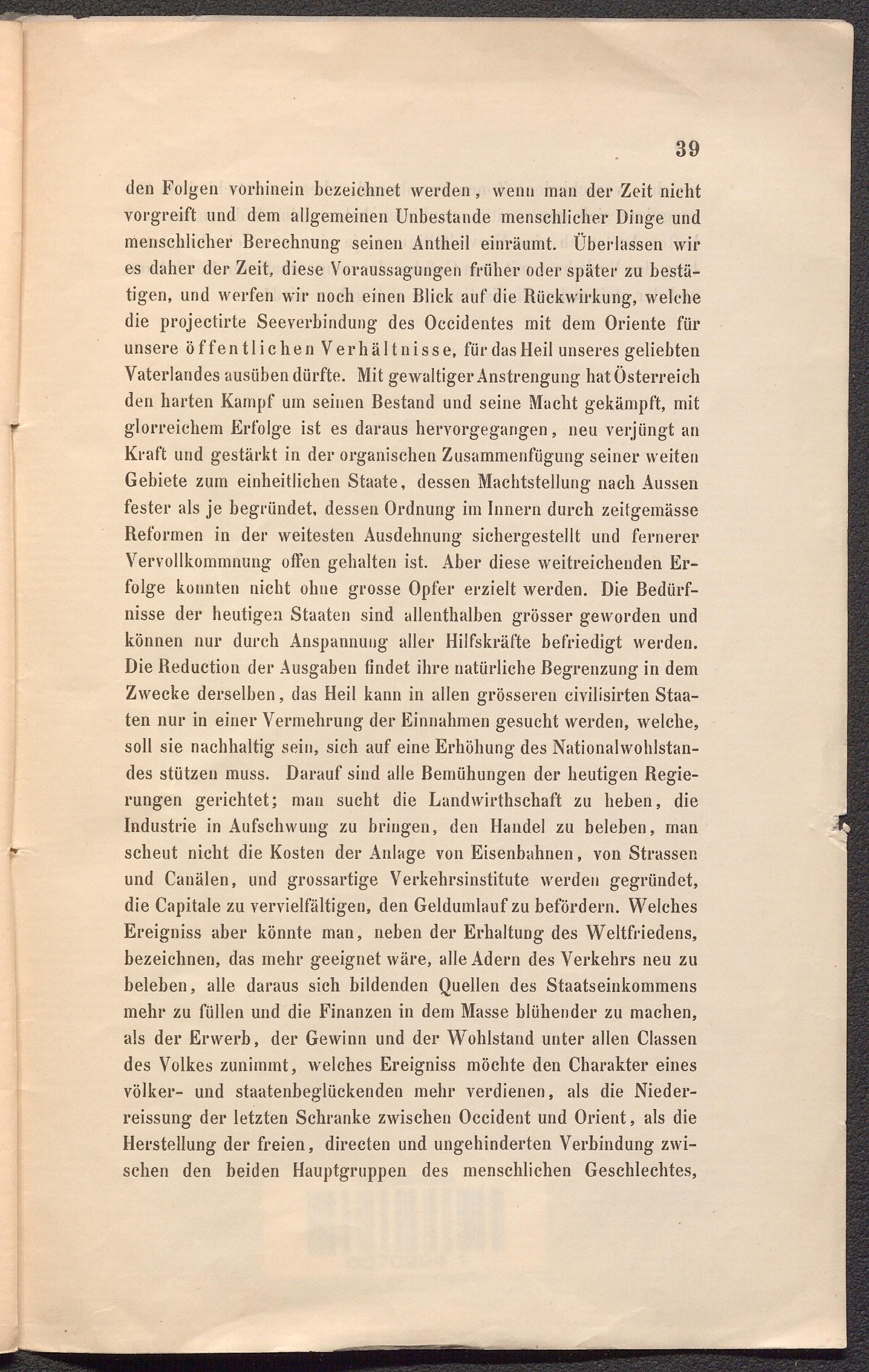 Kraft und gestärkt in der organischen Zusammenfügung seiner weiten Gebiete zum einheitlichen Staate, dessen Machtstellung nach Aussen fester als je begründet, dessen Ordnung im Innern durch zeitgemässe Reformen in der weitesten Ausdehnung sichergestellt und fernerer Vervollkommnung offen gehalten ist. Aber diese weitreichenden Erfolge konnten nicht ohne grosse Opfer erzielt werden. Die Bedürfnisse der heutigen Staaten sind allenthalben grösser geworden und können nur durch Anspannung aller Hilfskräfte befriedigt werden. Die Reduction der Ausgaben findet ihre natürliche Begrenzung in dem Zwecke derselben, das Heil kann in allen grösseren civilisirten Staaten nur in einer Vermehrung der Einnahmen gesucht werden, welche, soll sie nachhaltig sein, sich auf eine Erhöhung des Nationalwohlstandes stützen muss. Darauf sind alle Bemühungen der heutigen Regierungen gerichtet; man sucht die Landwirthschaft zu heben, die Industrie in Aufschwung zu bringen, den Handel zu beleben, man scheut nicht die Kosten der Anlage von Eisenbahnen, von Strassen und Canälen, und grossartige Verkehrsinstitute werden gegründet, die Capitale zu vervielfältigen, den Geldumlauf zu befördern. Welches Ereigniss aber könnte man, neben der Erhaltung des Weltfriedens, bezeichnen, das mehr geeignet wäre, alle Adern des Verkehrs neu zu beleben, alle daraus sich bildenden Quellen des Staatseinkommens mehr zu füllen und die Finanzen in dem Masse blühender zu machen, als der Erwerb, der Gewinn und der Wohlstand unter allen Classen des Volkes zunimmt, welches Ereigniss möchte den Charakter eines Völker- und staatenbeglückenden mehr verdienen, als die Nieder- reissung der letzten Schranke zwischen Occident und Orient, als die Herstellung der freien, directen und ungehinderten Verbindung zwischen den beiden Hauptgruppen des menschlichen Geschlechtes,