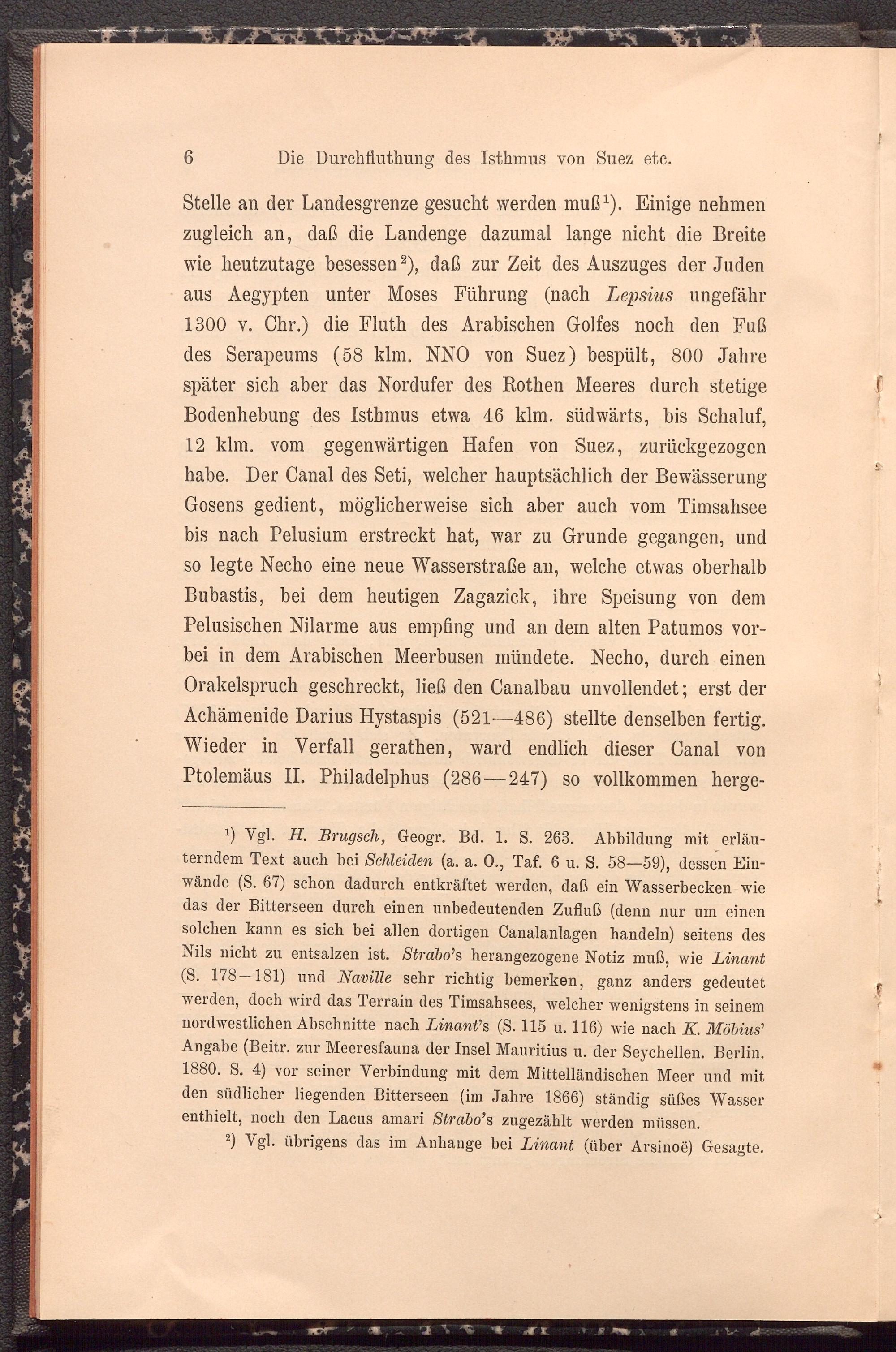 0 Ygl. II. Brugsch, Geogr. Bd. 1. S. 263. Abbildung mit erläuterndem Text auch bei Schleiden (a. a. 0., Taf. 6 u. S. 58—59), dessen Einwände (S. 67) schon dadurch entkräftet werden, daß ein Wasserbecken wie das der Bitterseen durch einen unbedeutenden Zufluß (denn nur um einen solchen kann es sich bei allen dortigen Canalanlagen handeln) seitens des Nils nicht zu entsalzen ist. Sträbo' > s herangezogene Notiz muß, wie Linant (S. 178 — 181) und Naville sehr richtig bemerken, ganz anders gedeutet werden, doch wird das Terrain des Timsahsees, welcher wenigstens in seinem nordwestlichen Abschnitte nach Linant 1 s (S. 115 u. 116) wie nach K. Möbius ’ Angabe (Beitr. zur Meeresfauna der Insel Mauritius u. der Seychellen. Berlin. 1880. S. 4) vor seiner Verbindung mit dem Mittelländischen Meer und mit den südlicher liegenden Bitterseen (im Jahre 1866) ständig süßes Wasser enthielt, noch den Lacus amari Strabo ’s zugezählt werden müssen.