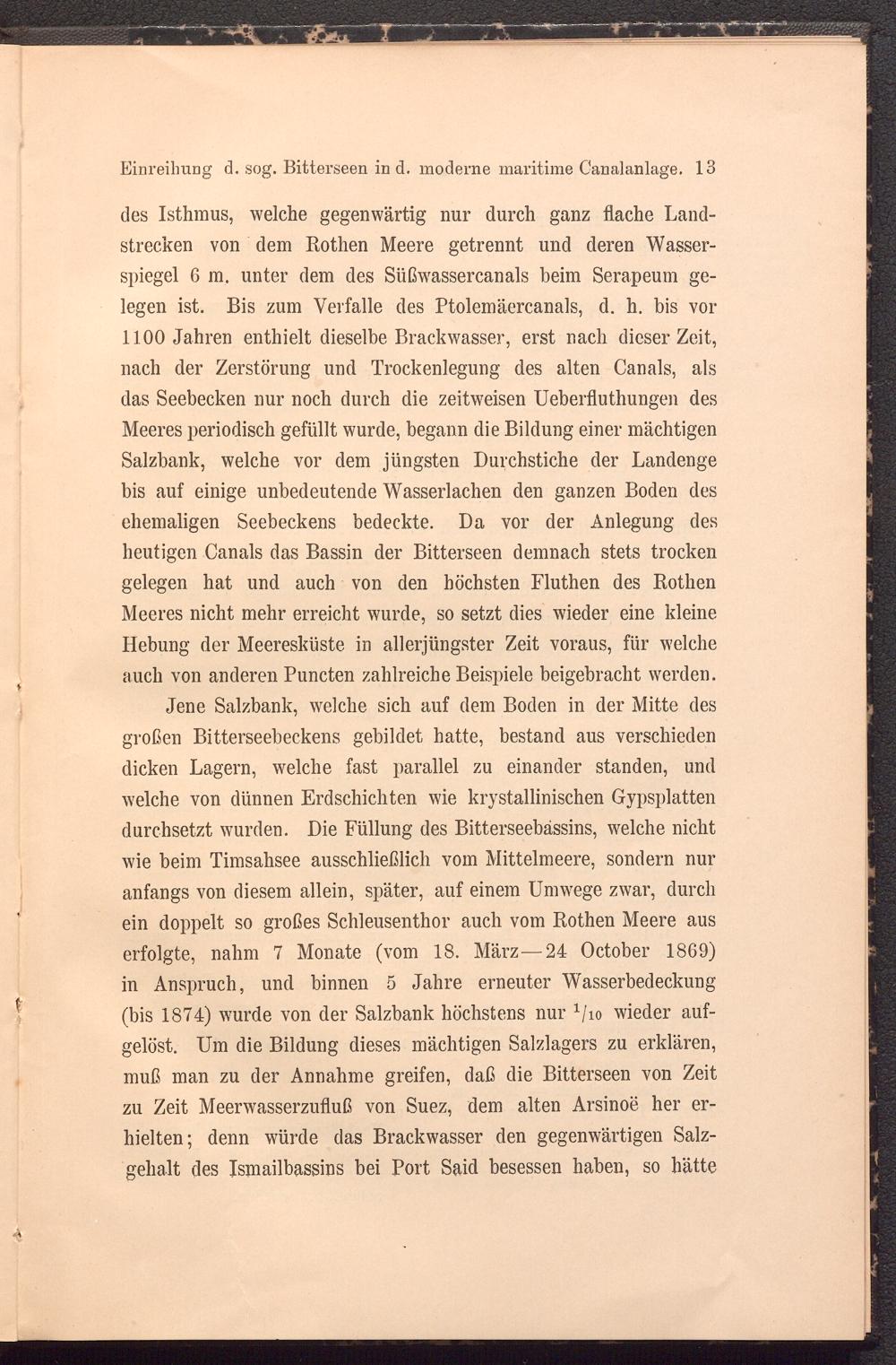 des Isthmus, welche gegenwärtig nur durch ganz flache Landstrecken von dem Rothen Meere getrennt und deren Wasserspiegel 6 m. unter dem des Süßwassercanals beim Serapeum gelegen ist. Bis zum Verfalle des Ptolemäercanals, d. h. bis vor 1100 Jahren enthielt dieselbe Brackwasser, erst nach dieser Zeit, nach der Zerstörung und Trockenlegung des alten Canals, als das Seebecken nur noch durch die zeitweisen Ueberfluthungen des Meeres periodisch gefüllt wurde, begann die Bildung einer mächtigen Salzbank, welche vor dem jüngsten Durchstiche der Landenge bis auf einige unbedeutende Wasserlachen den ganzen Boden des ehemaligen Seebeckens bedeckte. Da vor der Anlegung des heutigen Canals das Bassin der Bitterseen demnach stets trocken gelegen hat und auch von den höchsten Fluthen des Rothen Meeres nicht mehr erreicht wurde, so setzt dies wieder eine kleine Hebung der Meeresküste in allerjüngster Zeit voraus, für welche auch von anderen Puncten zahlreiche Beispiele beigebracht werden.