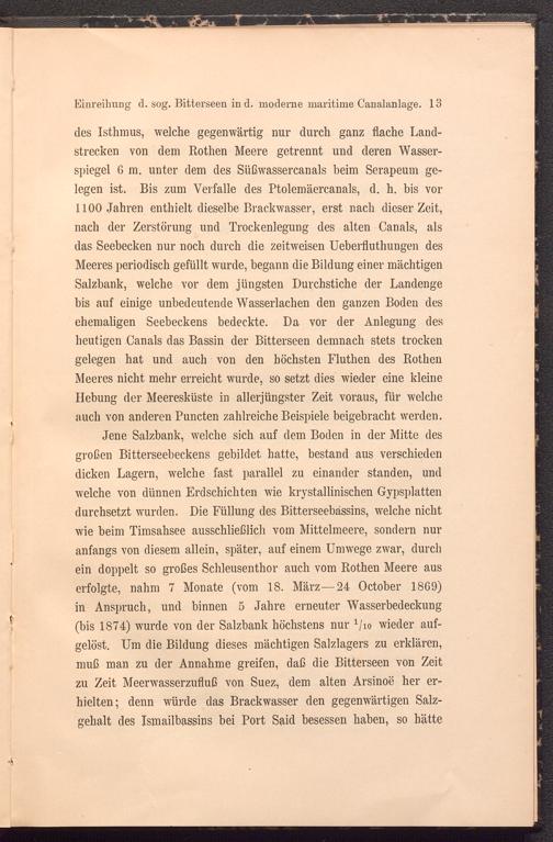 Jene Salzbank, welche sich auf dem Boden in der Mitte des großen Bitterseebeckens gebildet hatte, bestand aus verschieden dicken Lagern, welche fast parallel zu einander standen, und welche von dünnen Erdschichten wie krystallinischen Gypsplatten durchsetzt wurden. Die Füllung des Bitterseebässins, welche nicht wie beim Timsahsee ausschließlich vom Mittelmeere, sondern nur anfangs von diesem allein, später, auf einem Umwege zwar, durch ein doppelt so großes Schleusenthor auch vom Rothen Meere aus erfolgte, nahm 7 Monate (vom 18. März —24 October 1869) in Anspruch, und binnen 5 Jahre erneuter Wasserbedeckung (bis 1874) wurde von der Salzbank höchstens nur 1 /io wieder aufgelöst. Um die Bildung dieses mächtigen Salzlagers zu erklären, muß man zu der Annahme greifen, daß die Bitterseen von Zeit zu Zeit Meerwasserzufluß von Suez, dem alten Arsinoe her erhielten; denn würde das Brackwasser den gegenwärtigen Salzgehalt des Ismailbassins bei Port Said besessen haben, so hätte