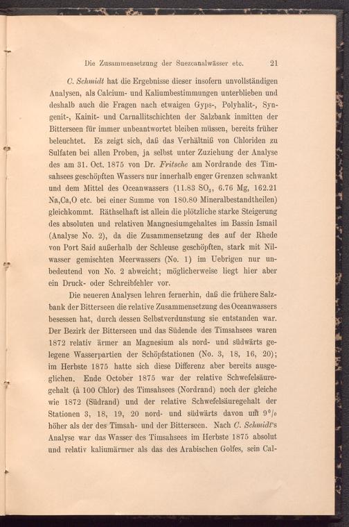 Die neueren Analysen lehren fernerhin, daß die frühere Salzbank der Bitterseen die relative Zusammensetzung des Oceanwassers besessen hat, durch dessen Selbstverdunstung sie entstanden war. Der Bezirk der Bitterseen und das Südende des Timsahsees waren 1872 relativ ärmer an Magnesium als nord- und südwärts gelegene Wasserpartien der Schöpfstationen (No. 3, 18, 16, 20); im Herbste 1875 hatte sich diese Differenz aber bereits ausgeglichen. Ende October 1875 war der relative Schwefelsäuregehalt (ä 100 Chlor) des Timsahsees (Nordrand) noch der gleiche wie 1872 (Südrand) und der relative Schwefelsäuregehalt der Stationen 3, 18, 19, 20 nord- und südwärts davon uih 9°/o höher als der des Timsah- und der Bitterseen. Nach C. Schmidt's Analyse war das Wasser des Timsahsees im Herbste 1875 absolut und relativ kaliumärmer als das des Arabischen Golfes, sein Cal-