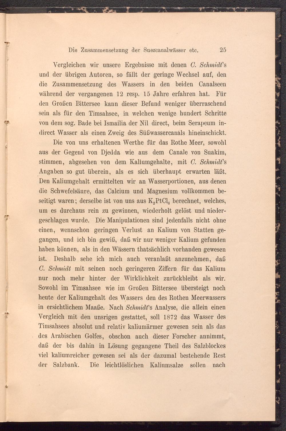 Die von uns erhaltenen Werthe für das Rothe Meer, sowohl aus der Gegend von Djedda wie aus dem Canale von Suakim, stimmen, abgesehen von dem Kaliumgehalte, mit C. Schmidt ’s Angaben so gut überein, als es sich überhaupt erwarten läßt. Den Kaliumgehalt ermittelten wir an Wasserportionen, aus denen die Schwefelsäure, das Calcium und Magnesium vollkommen beseitigt waren; derselbe ist von uns aus K 2 PtCl 6 berechnet, welches, um es durchaus rein zu gewinnen, wiederholt gelöst und niedergeschlagen wurde. Die Manipulationen sind jedenfalls nicht ohne einen, wennschon geringen Verlust an Kalium von Statten gegangen, und ich bin gewiß, daß wir nur weniger Kalium gefunden haben können, als in den Wässern thatsächlich vorhanden gewesen ist. Deshalb sehe ich mich auch veranlaßt anzunehmen, daß G. Schmidt mit seinen noch geringeren Ziffern für das Kalium nur noch mehr hinter der Wirklichkeit zurückbleibt als wir. Sowohl im Timsahsee wie im Großen Bittersee übersteigt noch heute der Kaliumgehalt des Wassers den des Rothen Meerwassers in ersichtlichem Maaße. Nach Schmidt' s Analyse, die allein einen Vergleich mit den unsrigen gestattet, soll 1872 das Wasser des Timsahsees absolut und relativ kaliumärmer gewesen sein als das des Arabischen Golfes, obschon auch dieser Forscher annimmt, daß der bis dahin in Lösung gegangene Theil des Salzblockes viel kaliumreicher gewesen sei als der dazumal bestehende Rest der Salzbank. Die leichtlöslichen Kaliumsalze sollen nach