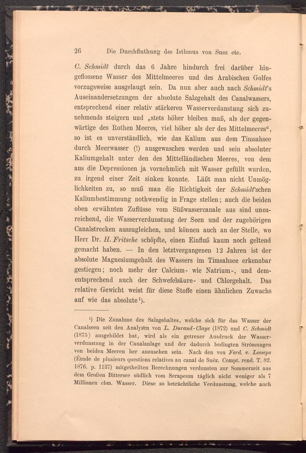 C. Schmidt durch das 6 Jahre hindurch frei darüber hingeflossene Wasser des Mittelmeeres und des Arabischen Golfes vorzugsweise ausgelaugt sein. Da nun aber auch nach Schmidt ’’s Auseinandersetzungen der absolute Salzgehalt des Canalwassers, entsprechend einer relativ stärkeren Wasser Verdunstung sich zu- nehmends steigern und „stets höher bleiben muß, als der gegenwärtige des Rothen Meeres, viel höher als der des Mittelmeeres“, so ist es unverständlich, wie das Kalium aus dem Timsahsee durch Meerwasser (!) ausgewaschen werden und sein absoluter Kaliumgehalt unter den des Mittelländischen Meeres, von dem aus die Depressionen ja vornehmlich mit Wasser gefüllt wurden, zu irgend einer Zeit sinken konnte. Läßt man nicht Unmöglichkeiten zu, so muß man die Richtigkeit der Schmiät^ch&a Kaliumbestimmung nothwendig in Frage stellen; auch die beiden oben erwähnten Zuflüsse vom Süßwassercanale aus sind unzureichend, die Wasserverdunstung der Seen und der zugehörigen Canalstrecken auszugleichen, und können auch an der Stelle, wo Herr Dr. H. Fritsche schöpfte, einen Einfluß kaum noch geltend gemacht haben. — In den letztvergangenen 12 Jahren ist der absolute Magnesiumgehalt des Wassers im Timsahsee erkennbar gestiegen; noch mehr der Calcium- wie Natrium-, und dementsprechend auch der Schwefelsäure- und Chlorgehalt. Das relative Gewicht weist für diese Stoffe einen ähnlichen Zuwachs auf wie das absolute 1 ).