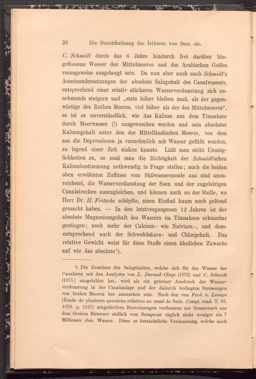 6 Die Zunahme des Salzgehaltes, welche sich für das Wasser der Canalseen seit den Analysen von L. Durand-Clciye (1872) und C. Schmidt (1875) ausgebildet hat, wird als ein getreuer Ausdruck der Wasserverdunstung in der Canalanlage und der dadurch bedingten Strömungen von beiden Meeren her anzusehen sein. Nach den von Ferd, v. Lesseps (Etüde de plusieurs questions relatives au canal de Suez. Compt. rend. T. 82. 1876. p. 1137) mitgetheilten Berechnungen verdunsten zur Sommerzeit aus dem Großen Bittersee südlich vom Serapeum täglich nicht weniger als 7 Millionen cbm. Wasser. Diese so beträchtliche Verdunstung, welche auch