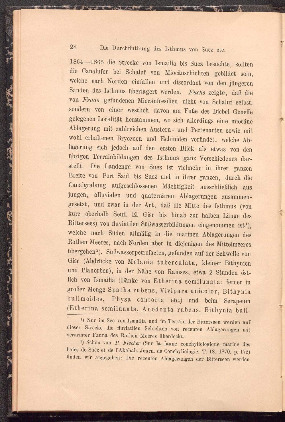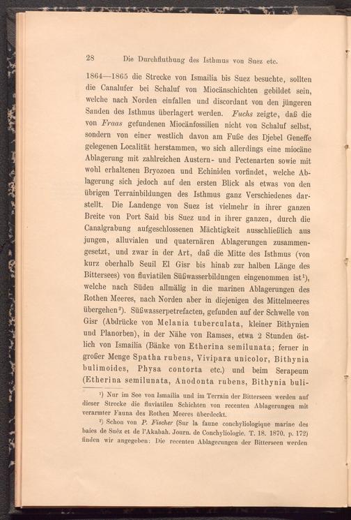 1864—1865 die Strecke von Ismailia bis Suez besuchte, sollten die Canalufer bei Sehaluf von Miocänschichten gebildet sein, welche nach Norden einfallen und discordant von den jüngeren Sauden des Isthmus überlagert werden. Fuchs zeigte, daß die von Fr aas gefundenen Miocänfossilien nicht von Sehaluf selbst, sondern von einer westlich davon am Fuße des Djebel Geneffe gelegenen Localität herstammen, wo sich allerdings eine mioeäne Ablagerung mit zahlreichen Austern- und Pectenarten sowie mit wohl erhaltenen Bryozoen und Echiniden vorfindet, welche Ablagerung sich jedoch auf den ersten Blick als etwas von den übrigen Terrainbildungen des Isthmus ganz Verschiedenes darstellt. Die Landenge von Suez ist vielmehr in ihrer ganzen Breite von Port Said bis Suez und in ihrer ganzen, durch die Canalgrabung aufgeschlossenen Mächtigkeit ausschließlich aus jungen, alluvialen und quaternären Ablagerungen zusammengesetzt, und zwar in der Art, daß die Mitte des Isthmus (von kurz oberhalb Seuil El Gisr bis hinab zur halben Länge des Bittersees) von fluviatilen Süßwasserbildungen eingenommen ist 1 ), welche nach Süden allmälig in die marinen Ablagerungen des Rothen Meeres, nach Norden aber in diejenigen des Mittelmeeres übergehen 2 ). Süßwasserpetrefacten, gefunden auf der Schwelle von Gisr (Abdrücke von Melania tuberculata, kleiner Bithynien und Planorben), in der Nähe von Ramses, etwa 2 Stunden Östlich von Ismailia (Bänke von Etherina semilunata; ferner in großer Menge Spatha rubens, Vivipara unicolor, Bithynia bulimoides, Physa contorta etc.) und beim Serapeum (Etherina semilunata, Anodonta rubens, Bithynia buli-