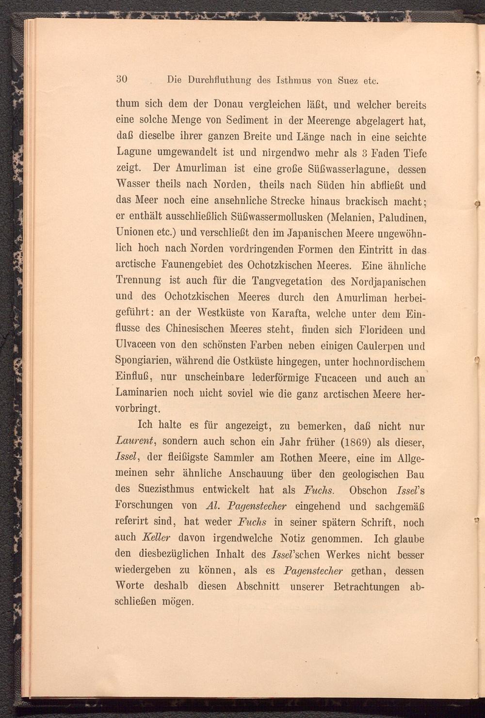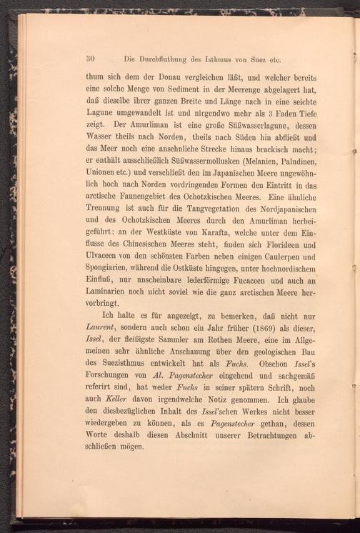 Ich halte es für angezeigt, zu bemerken, daß nicht nur Laurent , sondern auch schon ein Jahr früher (1869) als dieser, Issel , der fleißigste Sammler am Rothen Meere, eine im Allgemeinen sehr ähnliche Anschauung über den geologischen Bau des Suezisthmus entwickelt hat als Fuchs. Obschon IsseV s Forschungen von Al. Pagenstecher eingehend und sachgemäß referirt sind, hat weder Fuchs in seiner spätem Schrift, noch auch Keller davon irgendwelche Notiz genommen. Ich glaube den diesbezüglichen Inhalt des Lsserschen Werkes nicht besser wiedergeben zu können, als es Pagenstecher gethan, dessen Worte deshalb diesen Abschnitt unserer Betrachtungen abschließen mögen.