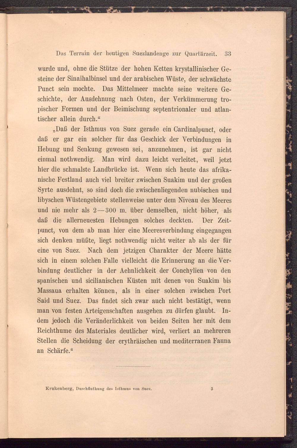 „Daß der Isthmus von Suez gerade ein Cardinalpunct, oder daß er gar ein solcher für das Geschick der Verbindungen in Hebung und Senkung gewesen sei, anzunehmen, ist gar nicht einmal nothwendig. Man wird dazu leicht verleitet, weil jetzt hier die schmälste Landbrücke ist. Wenn sich heute das afrikanische Festland auch viel breiter zwischen Suakim und der großen Syrte ausdehnt, so sind doch die zwischenliegenden nubischen und libyschen Wüstengebiete stellenweise unter dem Niveau des Meeres und nie mehr als 2 — 300 m. über demselben, nicht höher, als daß die allerneuesten Hebungen solches deckten. Der Zeit- punct, von dem ab man hier eine Meeresverbindung eingegangen sich denken müßte, liegt nothwendig nicht weiter ab als der für eine von Suez. Nach dem jetzigen Charakter der Meere hätte sich in einem solchen Falle vielleicht die Erinnerung an die Verbindung deutlicher in der Aehnlichkeit der Conchylien von den spanischen und sicilianischen Küsten mit denen von Suakim bis Massaua erhalten können, als in einer solchen zwischen Port Said und Suez. Das findet sich zwar auch nicht bestätigt, wenn man von festen Arteigenschaften ausgehen zu dürfen glaubt. Indem jedoch die Veränderlichkeit von beiden Seiten her mit dem Reichthume des Materiales deutlicher wird, verliert an mehreren Stellen die Scheidung der erythräischen und mediterranen Fauna an Schärfe.“