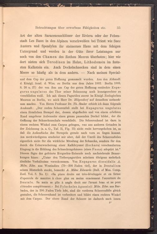 und dem Cap der guten Hoffnung gesammelt wurden. Aus den Abhandl. d. Königl. Acad. d. Wiss. zu Berlin aus dem Jahre 1882. Berlin 1883. S. 26 u. 27) der von ihm am Cap der guten Hoffnung entdeckte Eupa- gurus ungulatus das Thor seiner Behausung noch kunstgerechter zu verschließen weiß. Ich sah diesen Paguriden zuerst im Königl. Zoologischen Museum zu Berlin, wo mich Herr Dr. Hilgendorf auf denselben aufmerksam machte. Von Herrn Professor Dr. Th. Studer erhielt ich dann folgende Auskunft: „Der rechte Scheerenfuß stellt bei Eupagurus ungulatus einen förmlichen Stempel dar, dessen abgeflachte und von einem erhöhten Rand umgebene Außenseite einen genau passenden Deckel bildet, der die Oeffnung der Schneckenschale verschließt. Die Scheerenhand ist dazu in einem rechten Winkel zum Carpus gebogen, was aus anderen Gründen in der Zeichnung (a. a. O., Taf. II, Fig. 13) nicht recht hervorgehohen ist, so daß die Außenfläche des Stempels gerade nach vorn zu liegen kommt. Am merkwürdigsten erscheint mir aber, daß der Umriß des Scheerenfußes eigentlich nicht für die wirkliche Mündung der Schnecke, sondern für den durch die Ueberwucherung einer Kalkbryozoë (Esch ara) verschmälerten Eingang in die Höhlung des Schneckengehäuses (eines Fu sus) adoptirt ist.“ Diesem fügte der gefeierte Kerguelen-Reisende noch nachstehende Bemerkungen hinzu: „Unter den Tiefseepaguriden scheinen übrigens mehrfach ähnliche Yerhältnisse vorzukommen. Yon Eupagurus discoidalis A. Miln. Edw. aus Westindien (70—200 Faden tief), der in Dentalium seinen Hinterleib steckt, bemerkt A. Milne Edwards (Bull, of Mus. Comp. Zool. Yol. 8. No. 1): «Sa pince droite est très-développée et en forme d’opercule de manière à clore plus ou moins exactement l’ouverture du Dentale. Sa main se plie à angle droit sur l’avant bras et ne peut s’étendre complètement.» Bei Pylocheles Agassizii Miln. Edw. aus Barbados, der in 200 .Faden Tiefe lebt, sind die vorderen Scheerenfüße gleich gestaltet, die Scheerenhand ist verbreitert und bildet einen rechten Winkel mit dem Carpus. Der obere Rand der Scheere ist dadurch nach innen