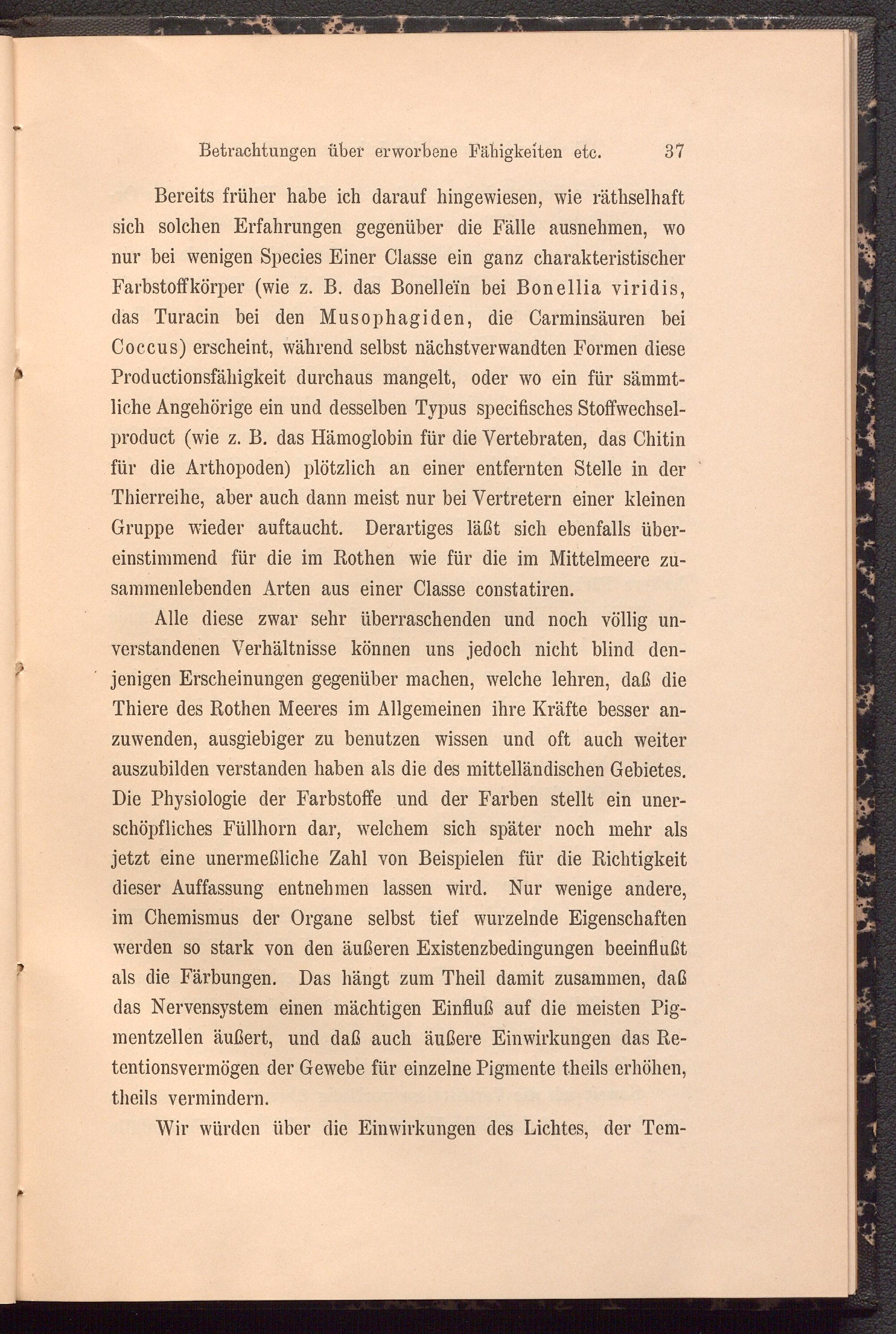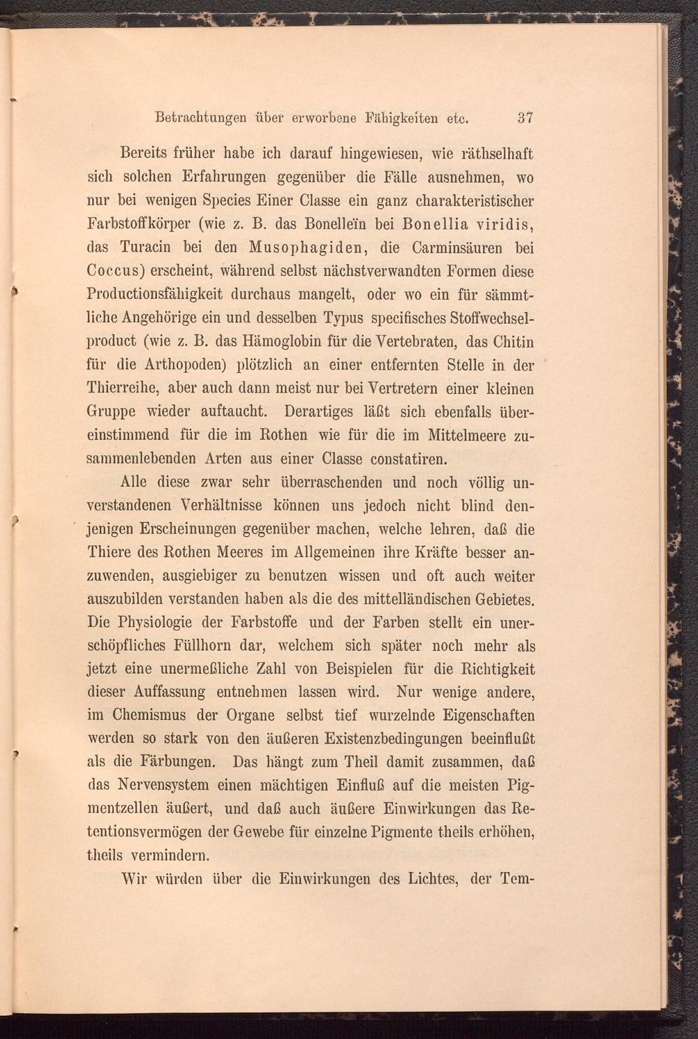 Bereits früher habe ich darauf hingewiesen, wie räthselhaft sich solchen Erfahrungen gegenüber die Fälle ausnehmen, wo nur bei wenigen Species Einer Classe ein ganz charakteristischer Farbstoffkörper (wie z. B. das Bonellein bei Bonellia viridis, das Turacin bei den Musophagiden, die Carminsäuren bei Coccus) erscheint, während selbst nächstverwandten Formen diese Productionsfähigkeit durchaus mangelt, oder wo ein für sämmt- liche Angehörige ein und desselben Typus specifisches Stoffwechsel- product (wie z. B. das Hämoglobin für die Vertebraten, das Chitin für die Arthopoden) plötzlich an einer entfernten Stelle in der Thierreihe, aber auch dann meist nur bei Vertretern einer kleinen Gruppe wieder auftaucht. Derartiges läßt sich ebenfalls übereinstimmend für die im Rothen wie für die im Mittelmeere zusammenlebenden Arten aus einer Classe constatiren.