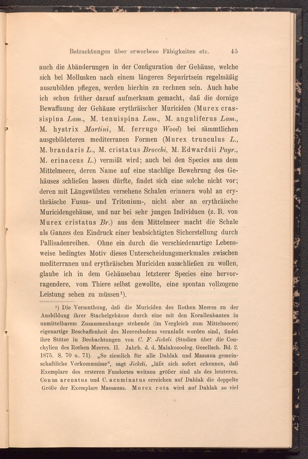 ihre Stütze in Beobachtungen von C. F. Jickeli (Studien über die Con- chylien des Rothen Meeres. II. Jahrb. d. d. Malakozoolog. Gesellsch. Bd. 2. 1875. S. 70 u. 71). „So ziemlich für alle Dahlak und Massaua gemeinschaftliche Vorkommnisse“, sagt Jickdi, „läßt sich sofort erkennen, daß Exemplare des ersteren Fundortes weitaus größer sind als des letzteren. Conus arenatus und C. acuminatus erreichen auf Dahlak die doppelte Größe der Exemplare Massauas. Murex rota wird auf Dahlak so viel