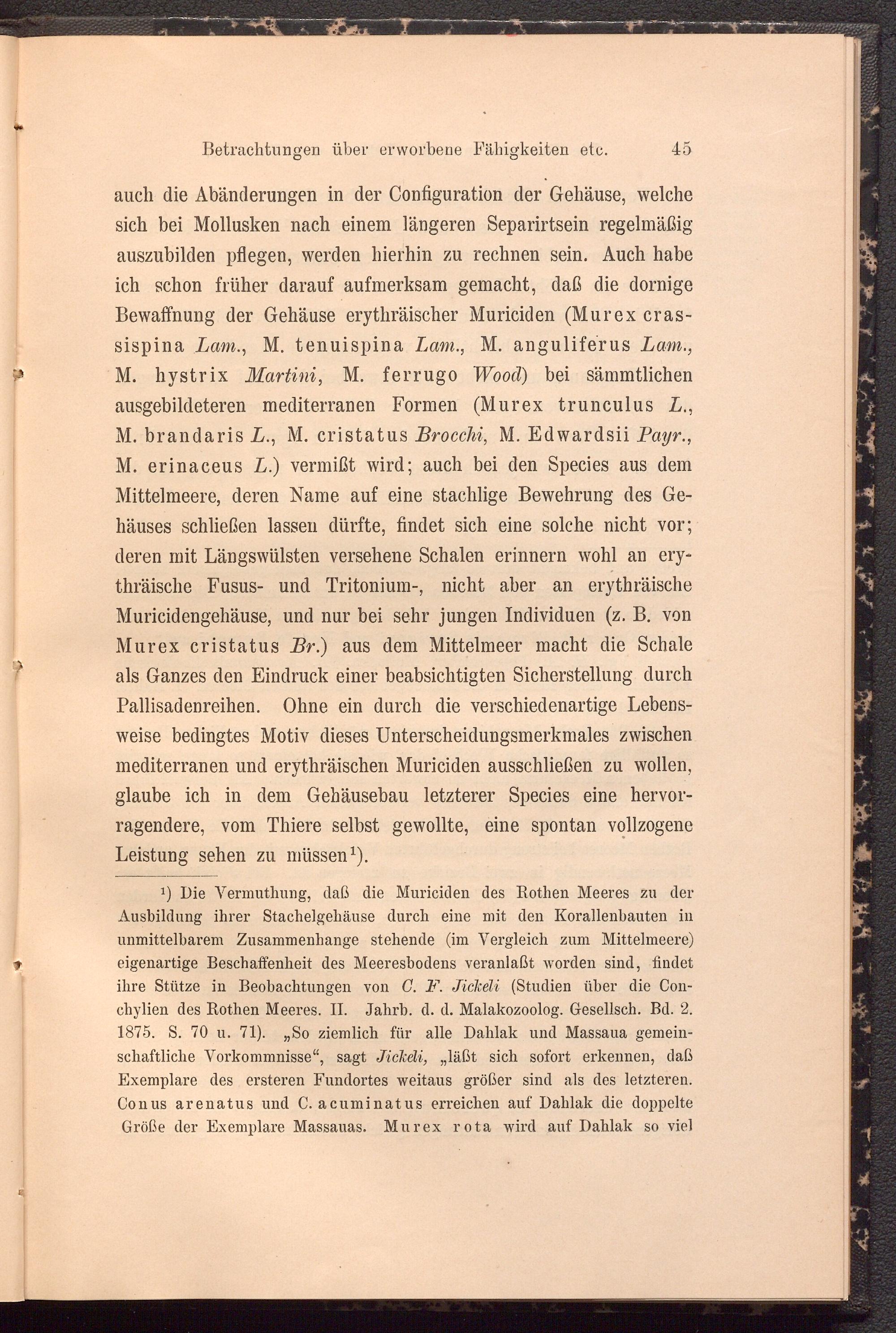 auch die Abänderungen in der Configuration der Gehäuse, welche sich bei Mollusken nach einem längeren Separirtsein regelmäßig auszubilden pflegen, werden hierhin zu rechnen sein. Auch habe ich schon früher darauf aufmerksam gemacht, daß die dornige Bewaffnung der Gehäuse erythräischer Muriciden (Murex cras- sispina Lam ., M. tenuispina Lam., M. anguliferus Lam., ** M. hystrix Martini , M. ferrugo Wood) bei sämmtlichen