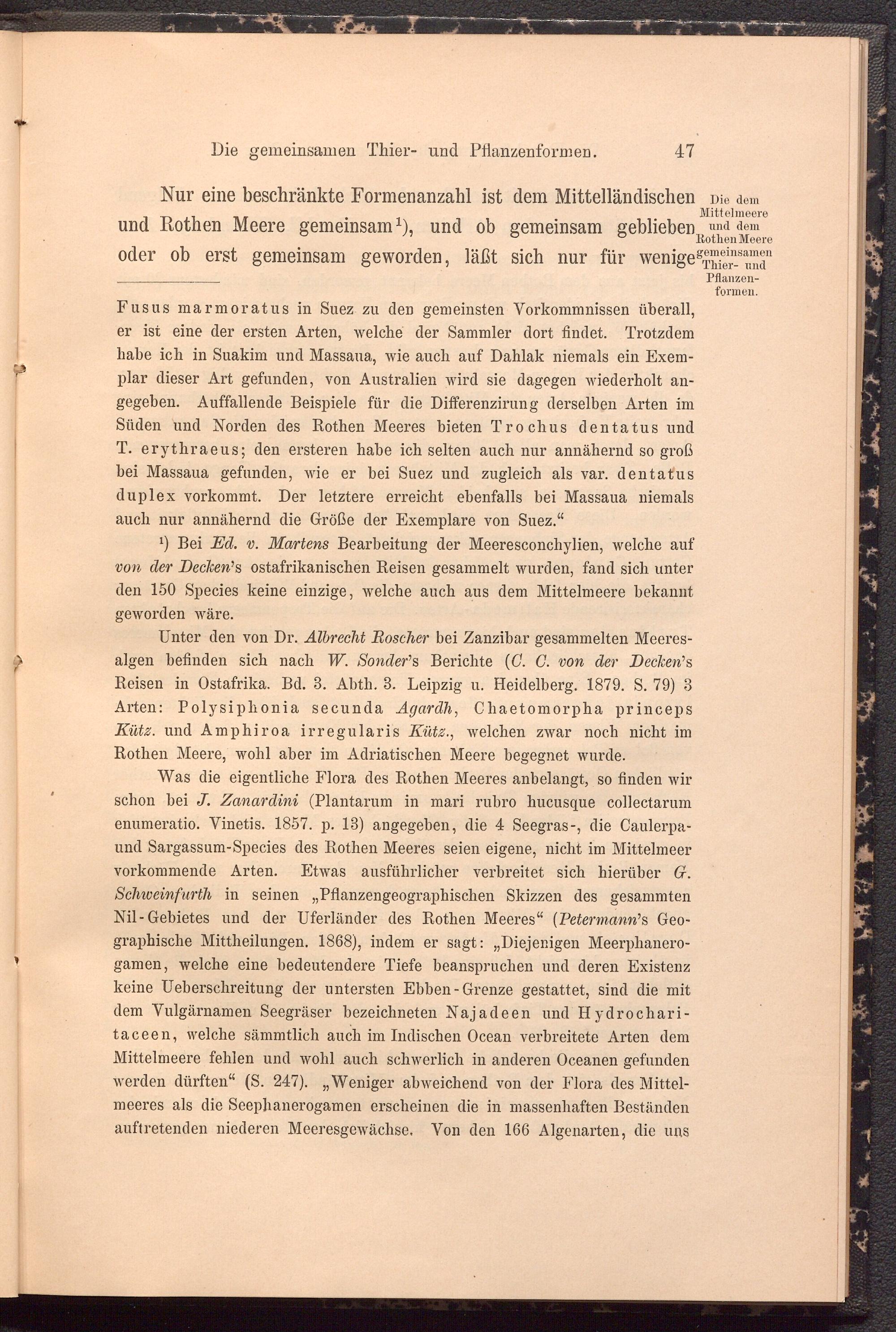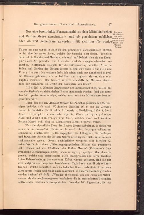 x ) Bei Ed. v. Martens Bearbeitung der Meeresconchylien, welche auf von der Deckend ostafrikanischen Reisen gesammelt wurden, fand sich unter den 150 Species keine einzige, welche auch aus dem Mittelmeere bekannt geworden wäre.
