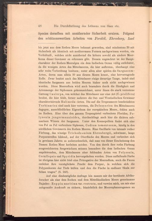 Auf eine diesbezügliche Anfrage hin nannte mir der berühmte Afrikaforscher als eine dem Rothen und dem Mittelländischen Meere gemeinsame Najadee: Ruppia maritima var. rostrata, und verwies mich, um mir eine zeitgemäße Auskunft zu sichern, hinsichtlich der Meeresphanerogamen an