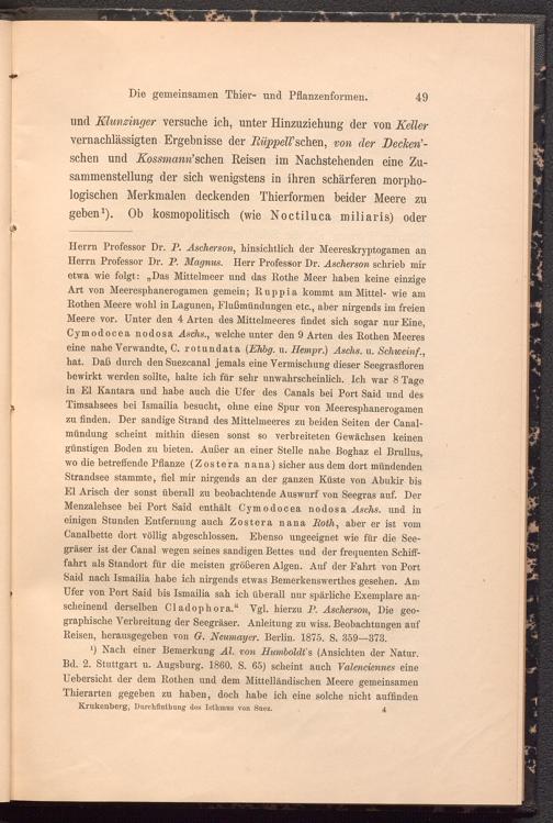 Herrn Professor Dr. P. Ascherson, hinsichtlich der Meereskryptogamen an Herrn Professor Dr. P. Magnus. Herr Professor Dr. Ascherson schrieb mir etwa wie folgt: „Das Mittelmeer und das Rothe Meer haben keine einzige Art von Meeresphanerogamen gemein; Rnppia kommt am Mittel- wie am Rothen Meere wohl in Lagunen, Flußmündungen etc., aber nirgends im freien Meere vor. Unter den 4 Arten des Mittelmeeres findet sich sogar nur Eine, Cymodocea nodosa Aschs., welche unter den 9 Arten des Rothen Meeres eine nahe Verwandte, C. rotundata (Ehbg. u. Hempr.) Aschs. u. Schweinf., hat. Daß durch den Suezcanal jemals eine Vermischung dieser Seegrasfloren bewirkt werden sollte, halte ich für sehr unwahrscheinlich. Ich war 8 Tage in El Kantara und habe auch die Ufer des Canals bei Port Said und des Timsahsees bei Ismailia besucht, ohne eine Spur von Meeresphanerogamen zu finden. Der sandige Strand des Mittelmeeres zu beiden Seiten der Canalmündung scheint mithin diesen sonst so verbreiteten Gewächsen keinen günstigen Roden zu bieten. Außer an einer Stelle nahe Boghaz el Brullus, wo die betreffende Pflanze (Zostera nana) sicher aus dem dort mündenden Strandsee stammte, fiel mir nirgends an der ganzen Küste von Abukir bis El Arisch der sonst überall zu beobachtende Auswurf von Seegras auf. Der Menzalehsee bei Port Said enthält Cymodocea nodosa Aschs. und in einigen Stunden Entfernung auch Zostera nana JRoth , aber er ist vom Canalbette dort völlig abgeschlossen. Ebenso ungeeignet wie für die Seegräser ist der Canal wegen seines sandigen Bettes und der frequenten Schifffahrt als Standort für die meisten größeren Algen. Auf der Fahrt von Port Said nach Ismailia habe ich nirgends etwas Bemerkenswerthes gesehen. Am Ufer von Port Said bis Ismailia sah ich überall nur spärliche Exemplare anscheinend derselben Cladophora.“ Vgl. hierzu P. Ascherson , Die geographische Verbreitung der Seegräser. Anleitung zu wiss. Beobachtungen auf Reisen, herausgegeben von G. 'Neumayer. Berlin. 1875. S. 359—373.