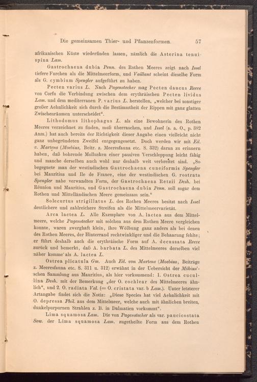 Lithodomus lithophagus L. als eine Bewohnerin des Rothen Meeres verzeichnet zu finden, muß überraschen, und Issel (a. a. 0., p. 382 Anm.) hat auch bereits der Richtigkeit dieser Angabe einen vielleicht nicht ganz unbegründeten Zweifel entgegengesetzt. Doch werden wir mit Ed. v. Martens ( Moebius , Beitr. z. Meeresfauna etc. S. 332) daran zu erinnern haben, daß bohrende Mollusken einer passiven Verschleppung leicht fähig und manche derselben auch wohl nur deshalb weit verbreitet sind. „So begegnete man der westindischen Gastrochaena cuneiformis Spengler bei Mauritius und Re de France, eine der westindischen G. rostrata Spengler nahe verwandten Form, der Gastrochaena Retzii Desh. bei Réunion und Mauritius, und Gastrochaena dubia Penn, soll sogar dem Rothen und Mittelländischen Meere gemeinsam sein.“