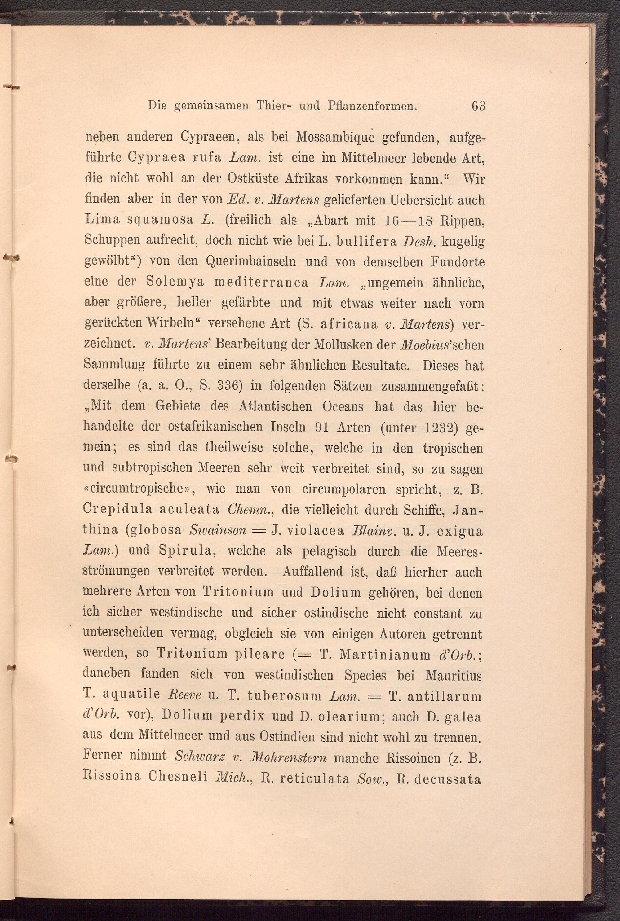 neben anderen Cypraeen, als bei Mossambique gefunden, aufgeführte Cypraea rufa Lam. ist eine im Mittelmeer lebende Art, die nicht wohl an der Ostküste Afrikas Vorkommen kann.“ Wir finden aber in der von Ed. v. Martens gelieferten Uebersicht auch Lima squamosa L. (freilich als „Abart mit 16 — 18 Rippen, Schuppen aufrecht, doch nicht wie bei L. bullifera Besh. kugelig gewölbt“) von den Querimbainseln und von demselben Fundorte eine der Solemya mediterranea Lam. „ungemein ähnliche, aber größere, heller gefärbte und mit etwas weiter nach vorn gerückten Wirbeln“ versehene Art (S. africana v. Martens) verzeichnet. v. Martens ’ Bearbeitung der Mollusken der Moebius'schein Sammlung führte zu einem sehr ähnlichen Resultate. Dieses hat derselbe (a. a. 0., S. 336) in folgenden Sätzen zusammengefaßt: „Mit dem Gebiete des Atlantischen Oceans hat das hier behandelte der ostafrikanischen Inseln 91 Arten (unter 1232) gemein; es sind das theilweise solche, welche in den tropischen und subtropischen Meeren sehr weit verbreitet sind, so zu sagen «eircumtropische», wie man von circumpolaren spricht, z. B. Crepidula aculeata Chemn ., die vielleicht durch Schiffe, Jan- thina (globosa Swainson = J. violacea Blainv. u. J. exigua Lam.) und Spirula, welche als pelagisch durch die Meeresströmungen verbreitet werden. Auffallend ist, daß hierher auch mehrere Arten von Tritonium und Dolium gehören, bei denen ich sicher westindische und sicher ostindische nicht constant zu unterscheiden vermag, obgleich sie von einigen Autoren getrennt werden, so Tritonium pileare (= T. Martinianum d'Orb.; ** daneben fanden sich von westindischen Species bei Mauritius