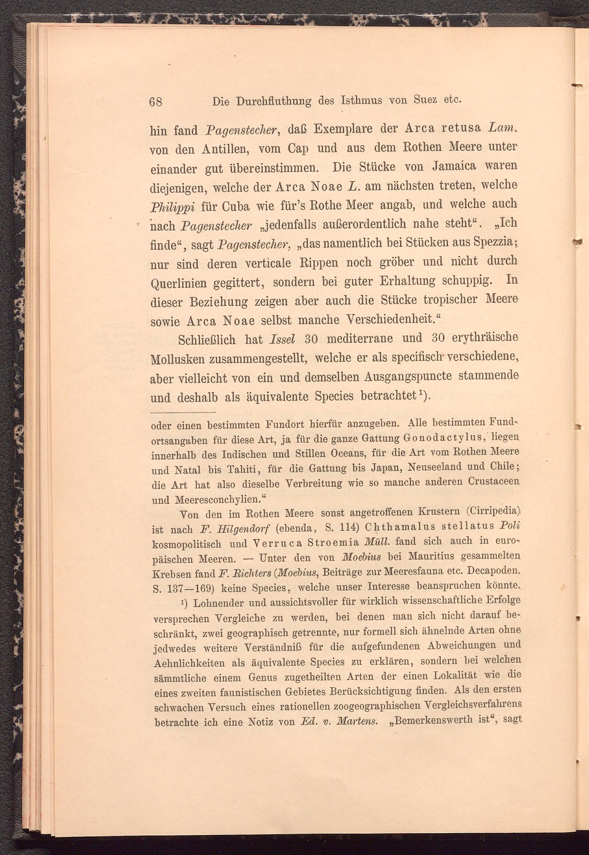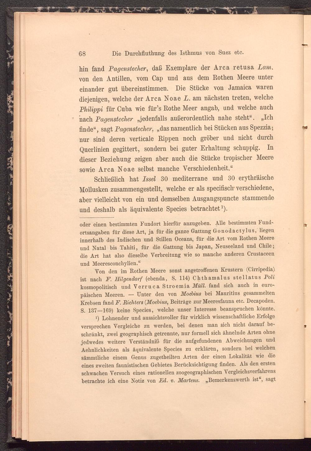 Schließlich hat Issel 30 mediterrane und 30 erythräische Mollusken zusammengestellt, welche er als specifisclr verschiedene, aber vielleicht von ein und demselben Ausgangspuncte stammende und deshalb als äquivalente Species betrachtet 1 ).
