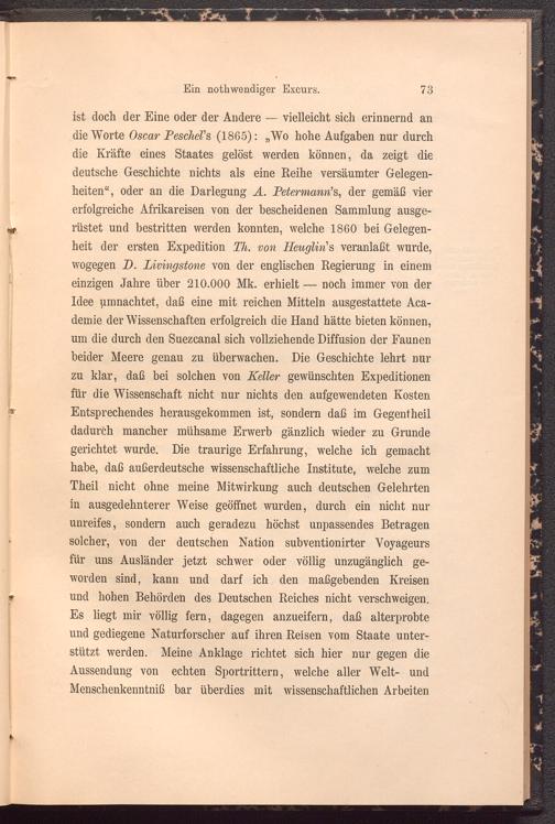 ist doch der Eine oder der Andere — vielleicht sich erinnernd an die Worte Oscar PescheVs (1865): „Wo hohe Aufgaben nur durch die Kräfte eines Staates gelöst werden können, da zeigt die deutsche Geschichte nichts als eine Reihe versäumter Gelegenheiten“, oder an die Darlegung A. Petermann’s, der gemäß vier erfolgreiche Afrikareisen von der bescheidenen Sammlung ausgerüstet und bestritten werden konnten, welche 1860 bei Gelegenheit der ersten Expedition Th. von Heuglin's veranlaßt wurde, wogegen D. Livingstone von der englischen Regierung in einem einzigen Jahre über 210.000 Mk. erhielt — noch immer von der Idee umnachtet, daß eine mit reichen Mitteln ausgestattete Académie der Wissenschaften erfolgreich die Hand hätte bieten können, um die durch den Suezcanal sich vollziehende Diffusion der Faunen beider Meere genau zu überwachen. Die Geschichte lehrt nur zu klar, daß bei solchen von Keller gewünschten Expeditionen für die Wissenschaft nicht nur nichts den aufgewendeten Kosten Entsprechendes herausgekommen ist, sondern daß im Gegentheil dadurch mancher mühsame Erwerb gänzlich wieder zu Grunde gerichtet wurde. Die traurige Erfahrung, welche ich gemacht habe, daß außerdeutsche wissenschaftliche Institute, welche zum Theil nicht ohne meine Mitwirkung auch deutschen Gelehrten in ausgedehnterer Weise geöffnet wurden, durch ein nicht nur unreifes, sondern auch geradezu höchst unpassendes Betragen solcher, von der deutschen Nation subventionirter Voyageurs für uns Ausländer jetzt schwer oder völlig unzugänglich geworden sind, kann und darf ich den maßgebenden Kreisen und hohen Behörden des Deutschen Reiches nicht verschweigen. Es liegt mir völlig fern, dagegen anzueifern, daß alterprobte und gediegene Naturforscher auf ihren Reisen vom Staate unterstützt werden. Meine Anklage richtet sich hier nur gegen die Aussendung von echten Sportrittern, welche aller Welt- und Menschenkenntniß bar überdies mit wissenschaftlichen Arbeiten