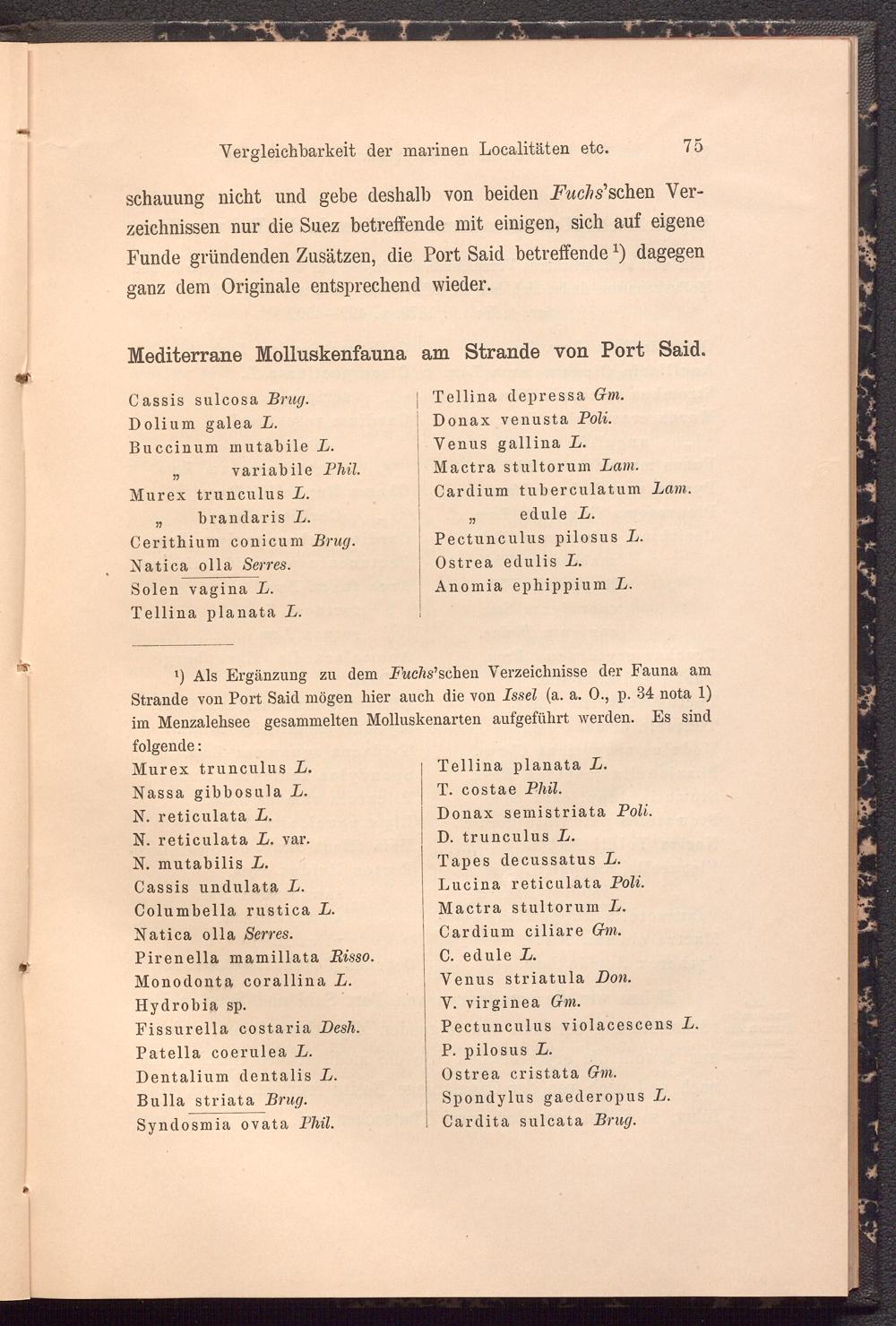 l ) Als Ergänzung zu dem Fuchs’sehen Verzeichnisse der Fauna am Strande von Port Said mögen hier auch die von Issel (a. a. 0., p. 34 nota 1) im Menzalehsee gesammelten Molluskenarten aufgeführt werden. Es sind