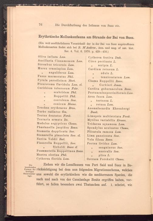Ziehen wir die Localfaunen von Port Said und Suez in Berücksichtigung bei dem nun folgenden Migrationsschema, welches uns sowohl die erythräischen wie die mediterranen Species, die nach und nach von der Canalanlage Besitz ergriffen haben, vorführt, so fallen besonders zwei Thatsachen auf. 1. scheint, wie