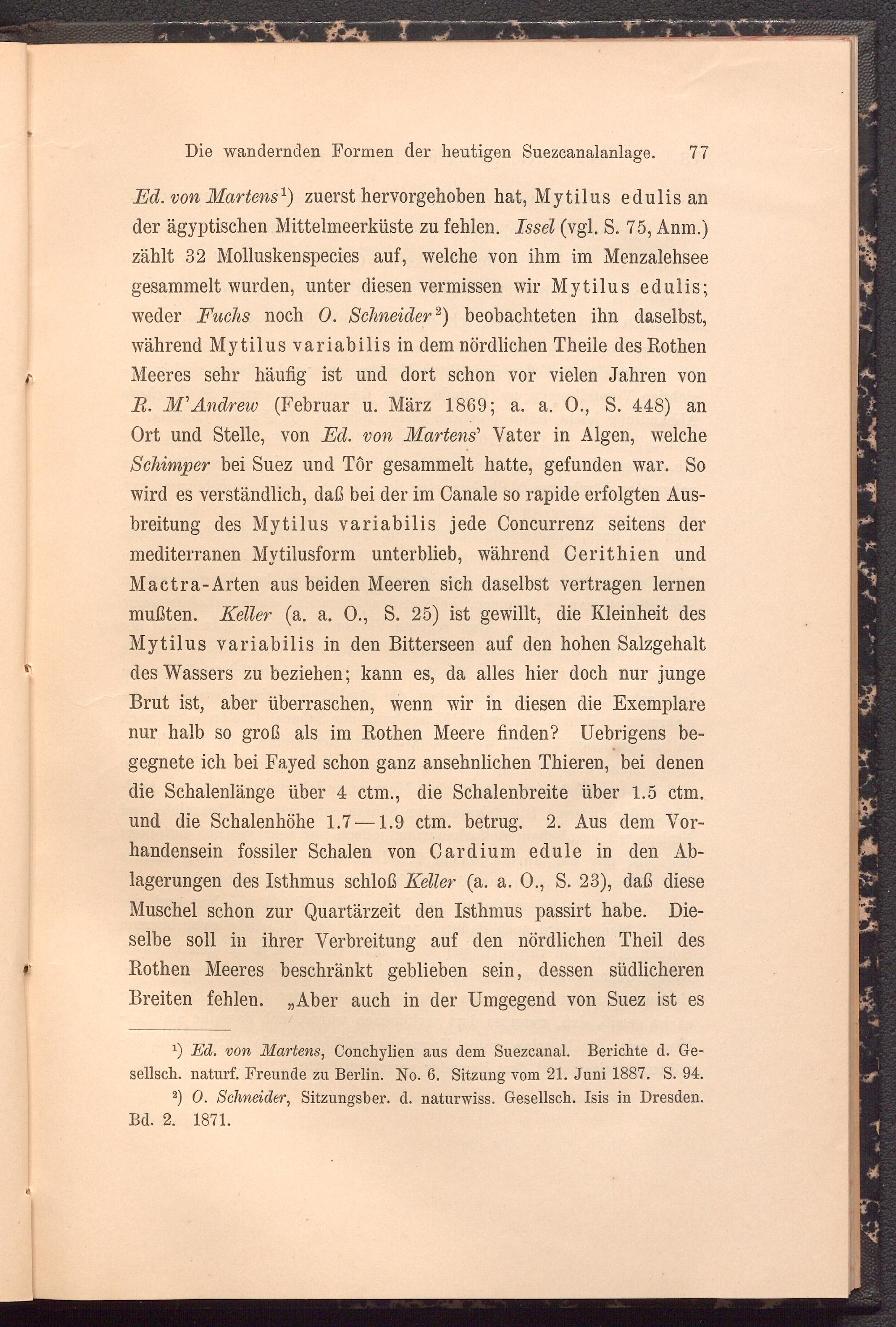 x ) Ed. von Martens , Conchylien aus dem Suezcanal. Berichte d. Ge- sellsch. naturf. Freunde zu Berlin. No. 6. Sitzung vom 21. Juni 1887. S. 94.