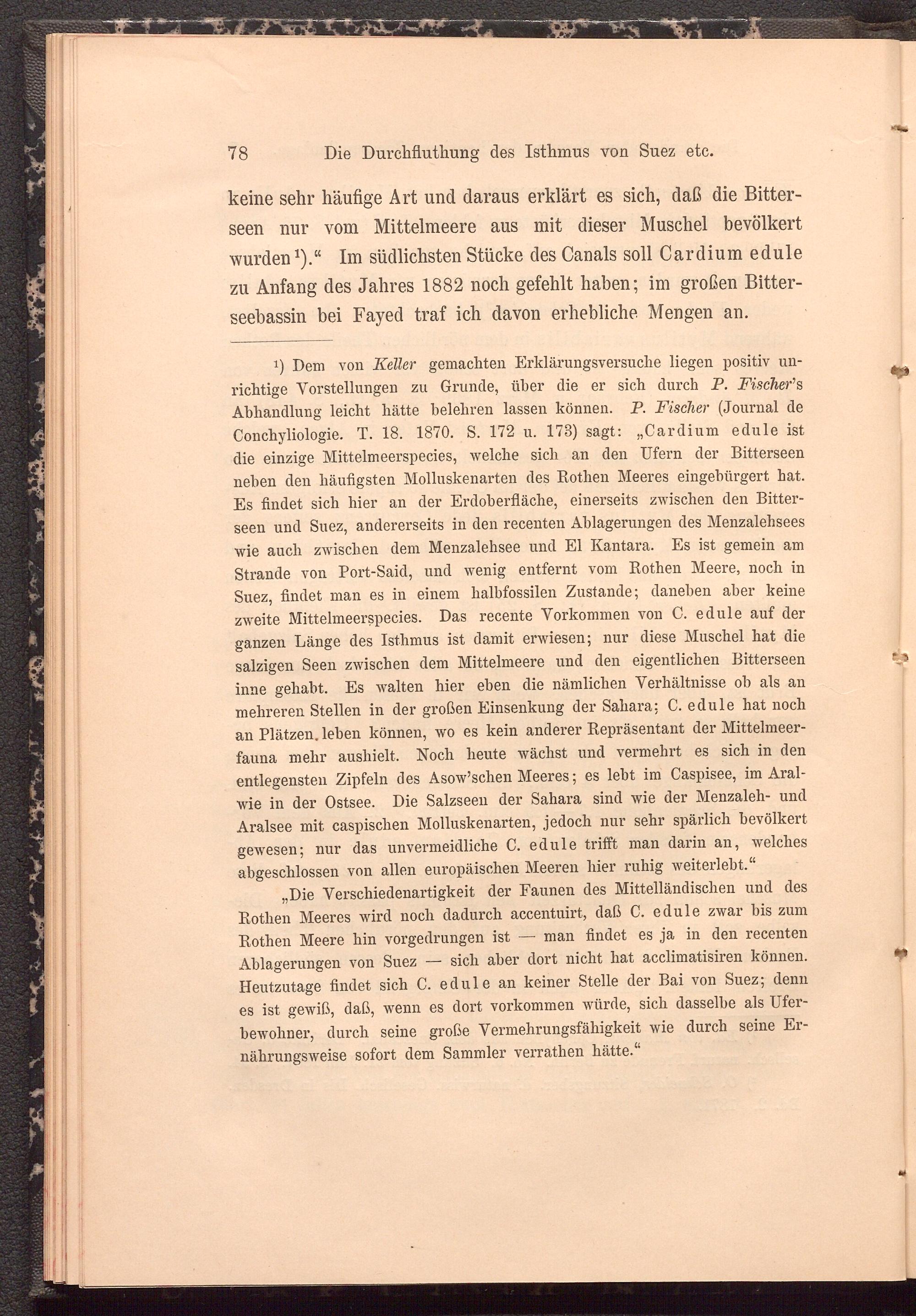1 ) Dem von Keller gemachten Erklärungsversuche liegen positiv unrichtige Vorstellungen zu Grunde, über die er sich durch P. Fischefs, Abhandlung leicht hätte belehren lassen können. P. Fischer (Journal de Conchyliologie. T. 18. 1870. S. 172 u. 173) sagt: „Cardium edule ist die einzige Mittelmeerspecies, welche sich an den Ufern der Bitterseen neben den häufigsten Molluskenarten des Rothen Meeres eingebürgert hat. Es findet sich hier an der Erdoberfläche, einerseits zwischen den Bitterseen und Suez, andererseits in den recenten Ablagerungen des Menzalehsees wie auch zwischen dem Menzalehsee und El Kantara. Es ist gemein am Strande von Port-Said, und wenig entfernt vom Rothen Meere, noch in Suez, findet man es in einem halbfossilen Zustande; daneben aber keine zweite Mittelmeerspecies. Das recente Vorkommen von C. edule auf der ganzen Länge des Isthmus ist damit erwiesen; nur diese Muschel hat die salzigen Seen zwischen dem Mittelmeere und den eigentlichen Bitterseen inne gehabt. Es walten hier eben die nämlichen Verhältnisse ob als an mehreren Stellen in der großen Einsenkung der Sahara; C. edule hat noch an Plätzen, leben können, wo es kein anderer Repräsentant der Mittelmeerfauna mehr aushielt. Noch heute wächst und vermehrt es sich in den entlegensten Zipfeln des Asow’schen Meeres; es lebt im Caspisee, im Aral- wie in der Ostsee. Die Salzseen der Sahara sind wie der Menzaleh- und Aralsee mit caspischen Molluskenarten, jedoch nur sehr spärlich bevölkert gewesen; nur das unvermeidliche C. edule trifft man darin an, welches abgeschlossen von allen europäischen Meeren hier ruhig weiterlebt.“