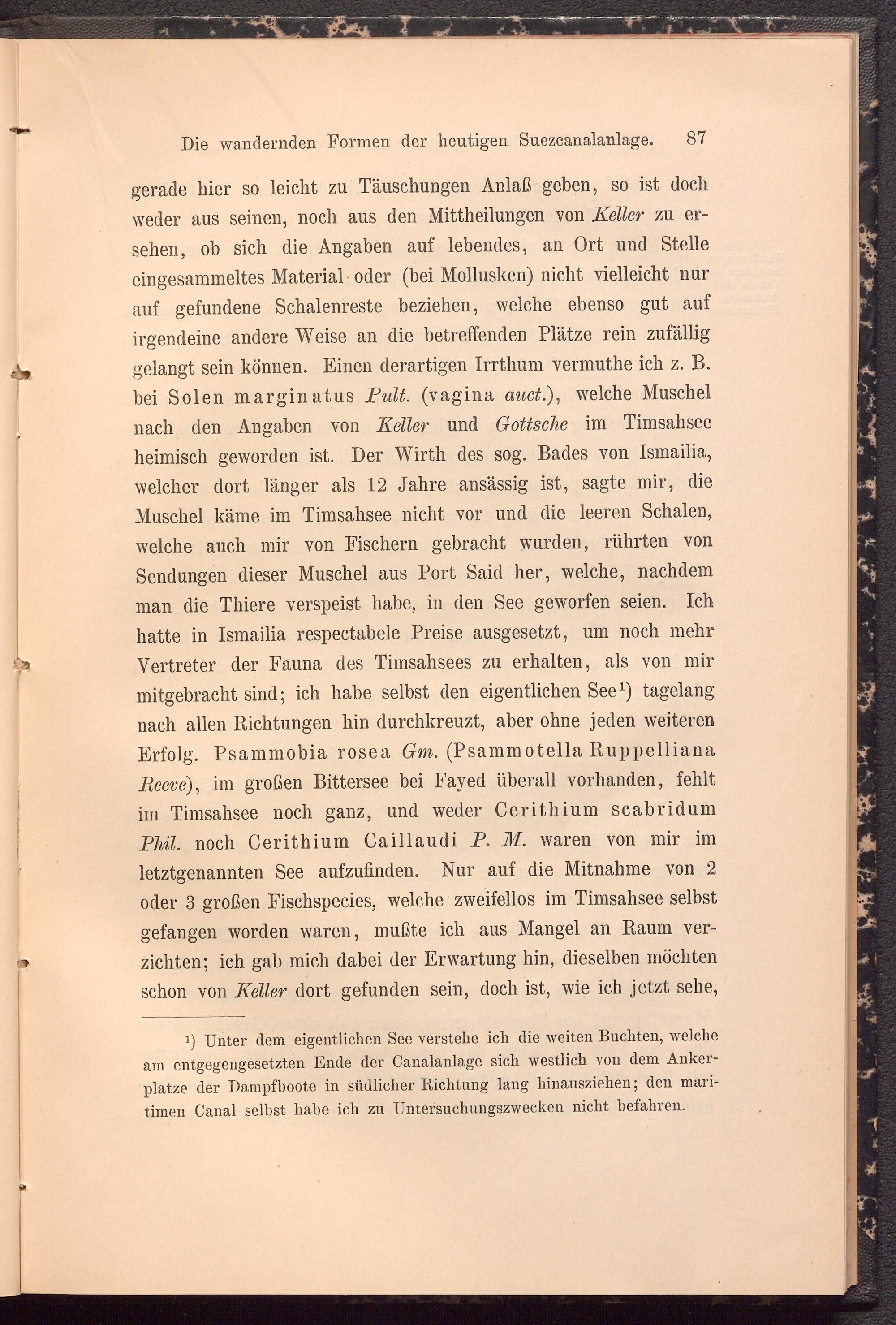 gerade hier so leicht zu Täuschungen Anlaß geben, so ist doch weder aus seinen, noch aus den Mittheilungen von Keller zu ersehen, ob sich die Angaben auf lebendes, an Ort und Stelle eingesammeltes Material oder (bei Mollusken) nicht vielleicht nur auf gefundene Schalenreste beziehen, welche ebenso gut auf irgendeine andere Weise an die betreifenden Plätze rein zufällig gelangt sein können. Einen derartigen Irrthum vermuthe ich z. B. bei Solen marginatus Pult, (vagina auct .), welche Muschel nach den Angaben von Keller und Gotische im Timsahsee heimisch geworden ist. Der Wirth des sog. Bades von Ismailia, welcher dort länger als 12 Jahre ansässig ist, sagte mir, die Muschel käme im Timsahsee nicht vor und die leeren Schalen, welche auch mir von Fischern gebracht wurden, rührten von Sendungen dieser Muschel aus Port Said her, welche, nachdem man die Tliiere verspeist habe, in den See geworfen seien. Ich hatte in Ismailia respectabele Preise ausgesetzt, um noch mehr Vertreter der Fauna des Timsahsees zu erhalten, als von mir mitgebracht sind; ich habe selbst den eigentlichen See 1 ) tagelang nach allen Pachtungen hin durchkreuzt, aber ohne jeden weiteren Erfolg. Psammobia rosea Gm. (Psammotella Ruppelliana Pieeve), im großen Bittersee bei Fayed überall vorhanden, fehlt im Timsahsee noch ganz, und weder Cerithium scabridum Phil, noch Cerithium Caillaudi P. M. waren von mir im letztgenannten See aufzufinden. Nur auf die Mitnahme von 2 oder 3 großen Fischspecies, welche zweifellos im Timsahsee selbst gefangen worden waren, mußte ich aus Mangel an Raum verzichten; ich gab mich dabei der Erwartung hin, dieselben möchten schon von Keller dort gefunden sein, doch ist, wie ich jetzt sehe,