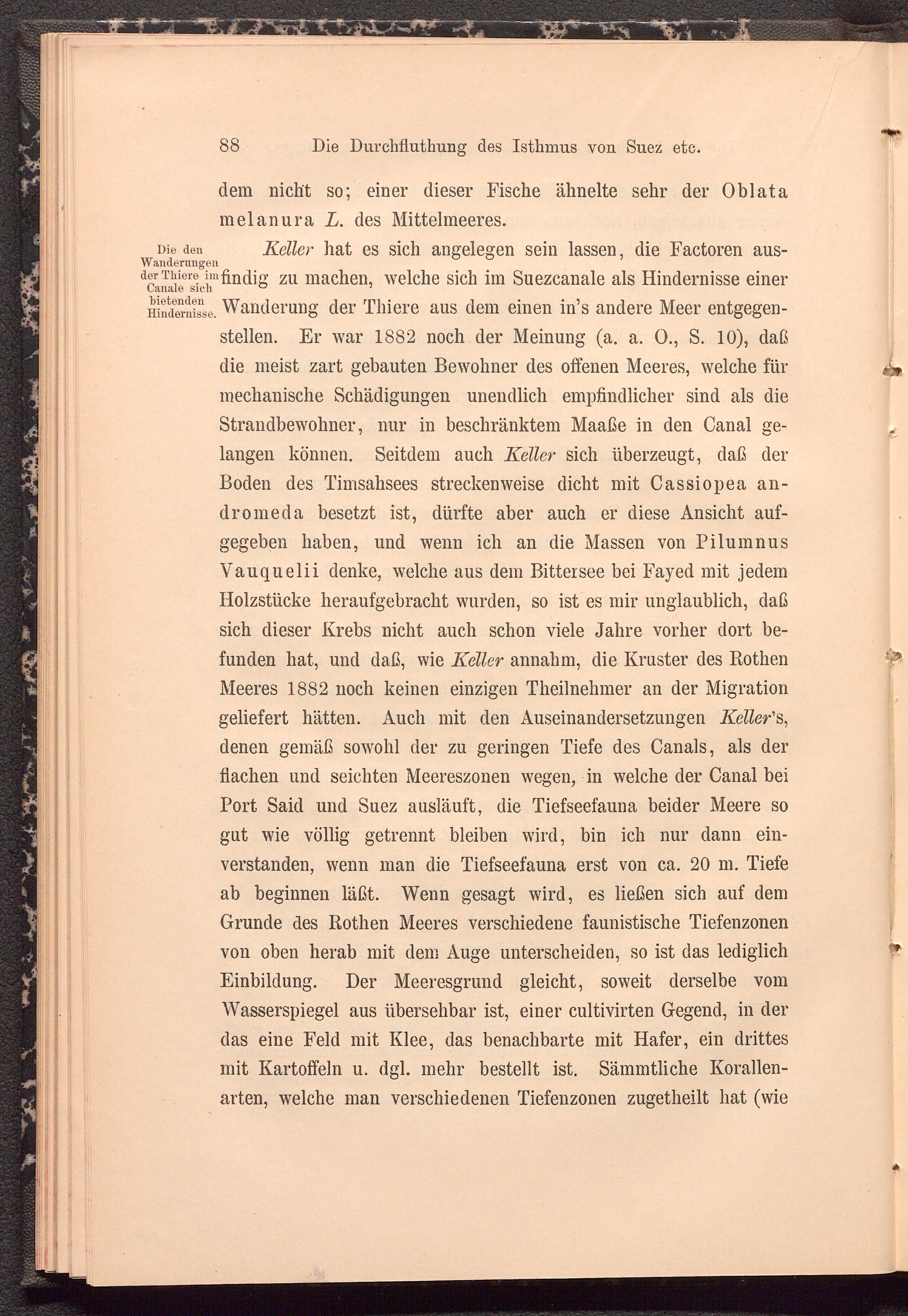 Hindernisse. Wanderung der Thiere aus dem einen in’s andere Meer entgegenstellen. Er war 1882 noch der Meinung (a. a. 0., S. 10), daß die meist zart gebauten Bewohner des offenen Meeres, welche für mechanische Schädigungen unendlich empfindlicher sind als die Strandbewohner, nur in beschränktem Maaße in den Canal gelangen können. Seitdem auch Keller sich überzeugt, daß der Boden des Timsahsees streckenweise dicht mit Cassiopea an- dromeda besetzt ist, dürfte aber auch er diese Ansicht aufgegeben haben, und wenn ich an die Massen von Pilumnus Vauquelii denke, welche aus dem Bitteisee bei Fayed mit jedem Holzstücke heraufgebracht wurden, so ist es mir unglaublich, daß sich dieser Krebs nicht auch schon viele Jahre vorher dort befunden hat, und daß, wie Keller annahm, die Kruster des Rothen Meeres 1882 noch keinen einzigen Theilnehmer an der Migration geliefert hätten. Auch mit den Auseinandersetzungen Keller' s, denen gemäß sowohl der zu geringen Tiefe des Canals, als der flachen und seichten Meereszonen wegen, in welche der Canal bei Port Said und Suez ausläuft, die Tiefseefauna beider Meere so gut wie völlig getrennt bleiben wird, bin ich nur dann einverstanden, wenn man die Tiefseefauna erst von ca. 20 m. Tiefe ab beginnen läßt. Wenn gesagt wird, es ließen sich auf dem Grunde des Rothen Meeres verschiedene faunistische Tiefenzonen von oben herab mit dem Auge unterscheiden, so ist das lediglich Einbildung. Der Meeresgrund gleicht, soweit derselbe vom Wasserspiegel aus übersehbar ist, einer cultivirten Gegend, in der das eine Feld mit Klee, das benachbarte mit Hafer, ein drittes mit Kartoffeln u. dgl. mehr bestellt ist. Sämmtliche Korallenarten, welche man verschiedenen Tiefenzonen zugetheilt hat (wie