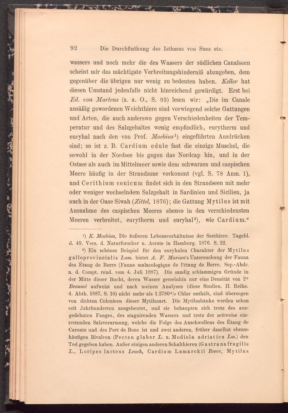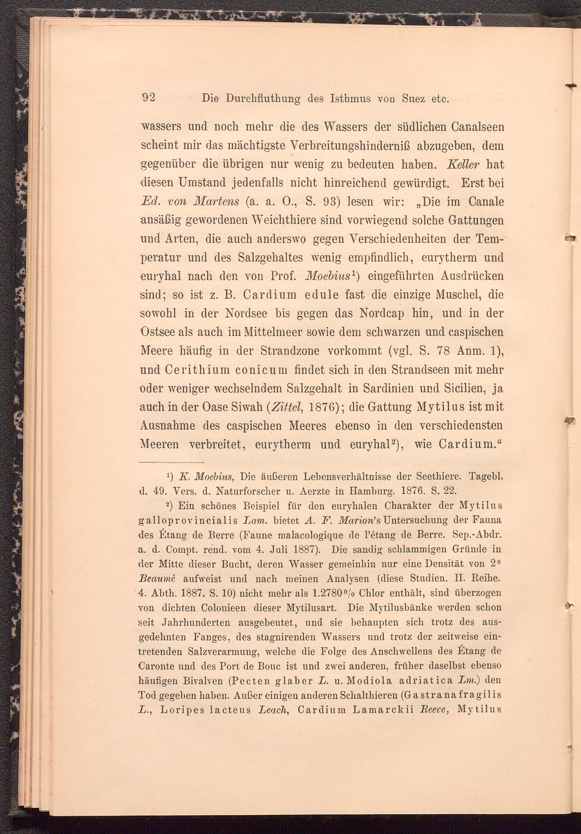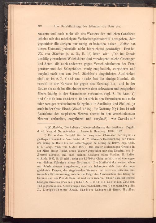 wassers und noch mehr die des Wassers der südlichen Canalseen scheint mir das mächtigste Yerbreitungshinderniß abzugeben, dem gegenüber die übrigen nur wenig zu bedeuten haben. Keller hat diesen Umstand jedenfalls nicht hinreichend gewürdigt. Erst bei Ed. von Martens (a. a. 0., S. 93) lesen wir: „Die im Canale ansäßig gewordenen Weichthiere sind vorwiegend solche Gattungen und Arten, die auch anderswo gegen Verschiedenheiten der Temperatur und des Salzgehaltes wenig empfindlich, eurytherm und euryhal nach den von Prof. Moebius 1 ) eingeführten Ausdrücken sind; so ist z. B. Cardium edule fast die einzige Muschel, die sowohl in der Nordsee bis gegen das Nordcap hin, und in der Ostsee als auch im Mittelmeer sowie dem schwarzen und caspischen Meere häufig in der Strandzone vorkommt (vgl. S. 78 Anm. 1), und Cerithium conicum findet sich in den Strandseen mit mehr oder weniger wechselndem Salzgehalt in Sardinien und Sicilien, ja auch in der Oase Siwah ( Zittel , 1876) ; die Gattung Mytilus ist mit Ausnahme des caspischen Meeres ebenso in den verschiedensten Meeren verbreitet, eurytherm und euryhal 2 ), wie Cardium.“