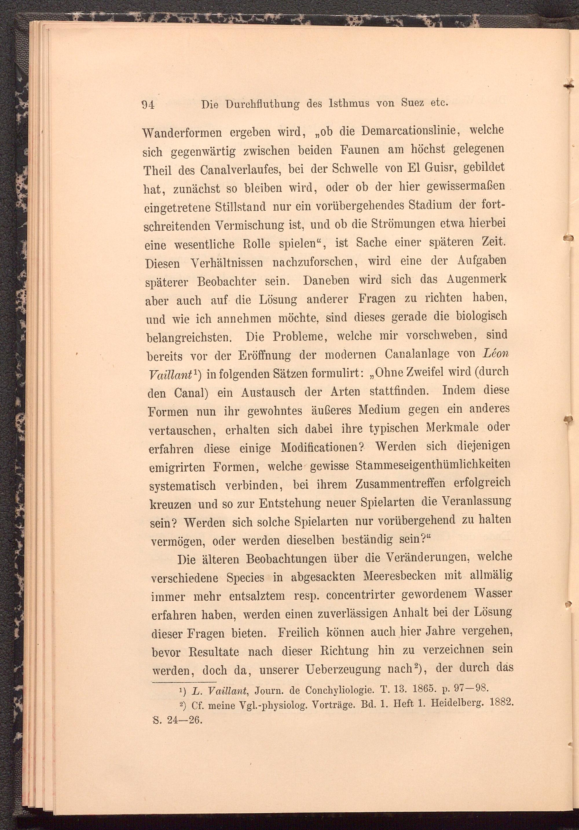 Wanderformen ergeben wird, „ob die Demarcationslinie, welche sich gegenwärtig zwischen beiden Faunen am höchst gelegenen Theil des Canalverlaufes, bei der Schwelle von El Guisr, gebildet hat, zunächst so bleiben wird, oder ob der hier gewissermaßen eingetretene Stillstand nur ein vorübergehendes Stadium der fortschreitenden Vermischung ist, und ob die Strömungen etwa hierbei eine wesentliche Rolle spielen“, ist Sache einer späteren Zeit. Diesen Verhältnissen nachzuforschen, wird eine der Aufgaben späterer Beobachter sein. Daneben wird sich das Augenmerk aber auch auf die Lösung anderer Fragen zu richten haben, und wie ich annehmen möchte, sind dieses gerade die biologisch belangreichsten. Die Probleme, welche mir vorschweben, sind bereits vor der Eröffnung der modernen Canalanlage von Léon Vaillant *) in folgenden Sätzen formulirt: „Ohne Zweifel wird (durch den Canal) ein Austausch der Arten stattfinden. Indem diese Formen nun ihr gewohntes äußeres Medium gegen ein anderes vertauschen, erhalten sich dabei ihre typischen Merkmale oder erfahren diese einige Modificationen? Werden sich diejenigen emigrirten Formen, welche gewisse Stammeseigenthümlichkeiten systematisch verbinden, bei ihrem Zusammentreffen erfolgreich kreuzen und so zur Entstehung neuer Spielarten die Veranlassung sein? Werden sich solche Spielarten nur vorübergehend zu halten vermögen, oder werden dieselben beständig sein?“