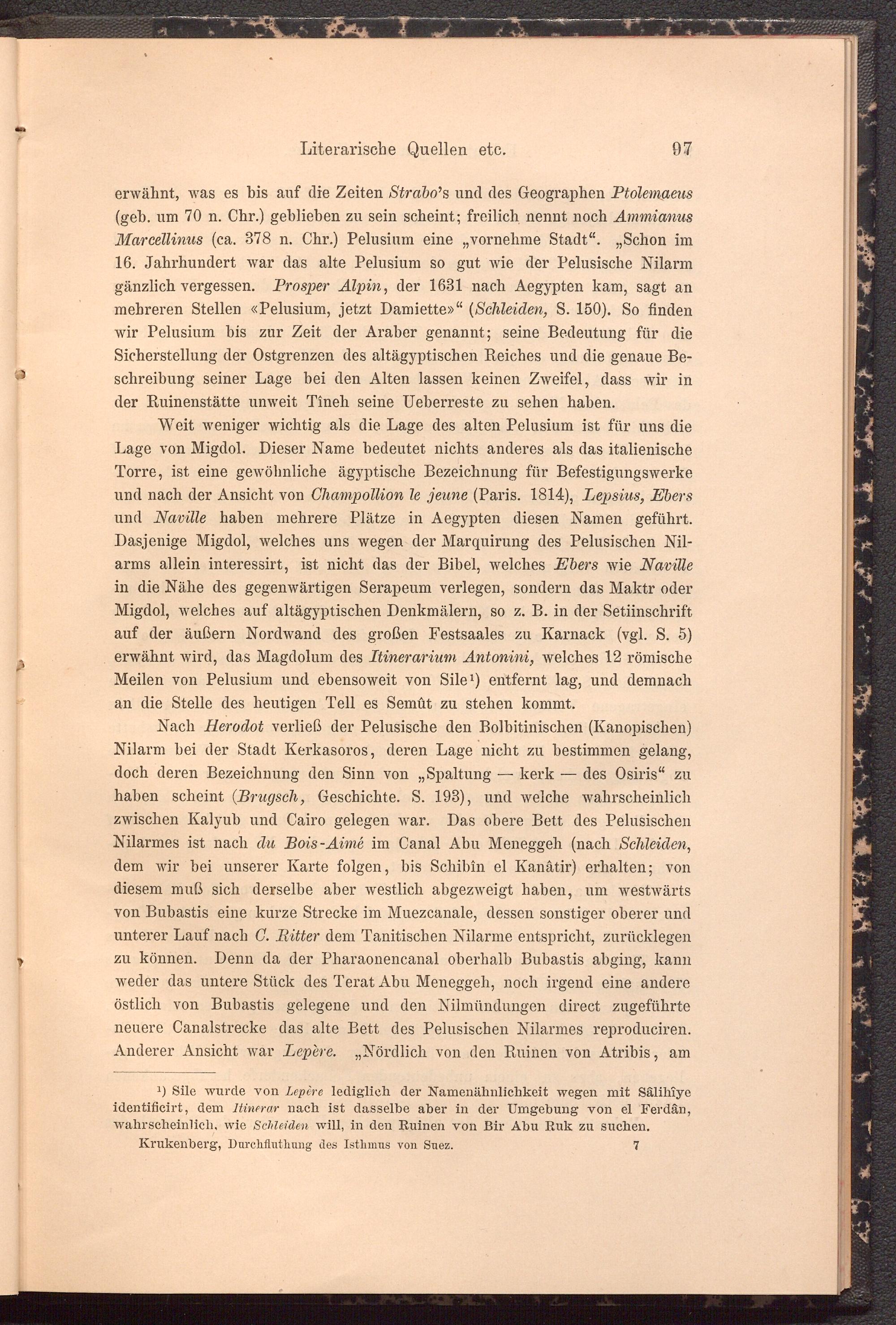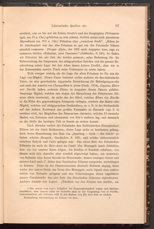 Nach Herodot verließ der Pelusische den Bolbitinischen (Kanopisehen) Nilarm bei der Stadt Kerkasoros, deren Lage nicht zu bestimmen gelang, doch deren Bezeichnung den Sinn von „Spaltung — kerk — des Osiris“ zu haben scheint ( Brugsch, Geschichte. S. 193), und welche wahrscheinlich zwischen Kalyub und Cairo gelegen war. Das obere Bett des Pelusischen Nilarmes ist nach du Bois-Aimé im Canal Abu Meneggeh (nach Schleiden , dem wir bei unserer Karte folgen, bis Schibin el Kanätir) erhalten; von diesem muß sich derselbe aber westlich abgezweigt haben, um westwärts von Bubastis eine kurze Strecke im Muezcanale, dessen sonstiger oberer und unterer Lauf nach C. Bitter dem Tanitischen Nilarme entspricht, zurücklegen zu können. Denn da der Pharaonencanal oberhalb Bubastis abging, kann weder das untere Stück des Terat Abu Meneggeh, noch irgend eine andere östlich von Bubastis gelegene und den Nilmündungen direct zugeführte neuere Canalstrecke das alte Bett des Pelusischen Nilarmes reproduciren. Anderer Ansicht war Lep'ere. „Nördlich von den Ruinen von Atribis, am