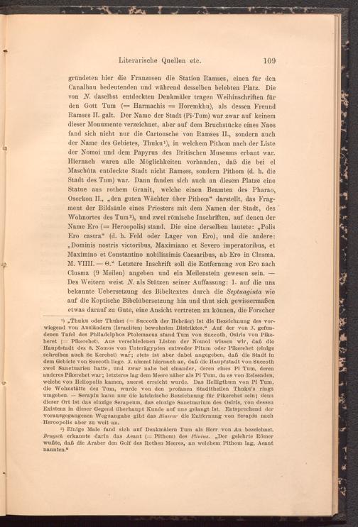 gründeten hier die Franzosen die Station Bamses, einen für den Canalbau bedeutenden und während desselben belebten Platz. Die von N. daselbst entdeckten Denkmäler tragen Weihinschriften für den Gott Tum (= Harmachis = Horemkhu), als dessen Freund Ramses IT. galt. Der Name der Stadt (Pi-Tum) war zwar auf keinem dieser Monumente verzeichnet, aber auf dem Bruchstücke eines Naos fand sich nicht nur die Cartousche von Ramses II., sondern auch der Name des Gebietes, Thuku 1 ), in welchem Pithom nach der Liste der Nomoi und dem Papyrus des Britischen Museums erbaut war. Hiernach waren alle Möglichkeiten vorhanden, daß die bei el Maschüta entdeckte Stadt nicht Ramses, sondern Pithom (d. h. die Stadt des Tum) war. Dann fanden sich auch an diesem Platze eine Statue aus rothem Granit, welche einen Beamten des Pharao, Osorkon II., „den guten Wächter über Pithom“ darstellt, das Fragment der Bildsäule eines Priesters mit dem Namen der Stadt, des Wohnortes des Tum 2 ), und zwei römische Inschriften, auf denen der Name Ero (= Heroopolis) stand. Die eine derselben lautete: „Polis Ero castra“ (d. h. Feld oder Lager von Ero), und die andere: „Dominis nostris victoribus, Maximiano et Severo imperatoribus, et Maximino et Constantino nobilissimis Caesaribus, ab Ero in Clusma. M. VIIII. — 0.“ Letztere Inschrift soll die Entfernung .von Piro nach Clusma (9 Meilen) angeben und ein Meilenstein gewesen sein. — Des Weitern weist JV. als Stützen seiner Auffassung: 1. auf die uns bekannte Uebersetzung des Bibeltextes durch die Septuaginta wie auf die Koptische Bibelübersetzung hin und tliut sich gewissermaßen etwas darauf zu Gute, eine Ansicht vertreten zu können, die Forscher