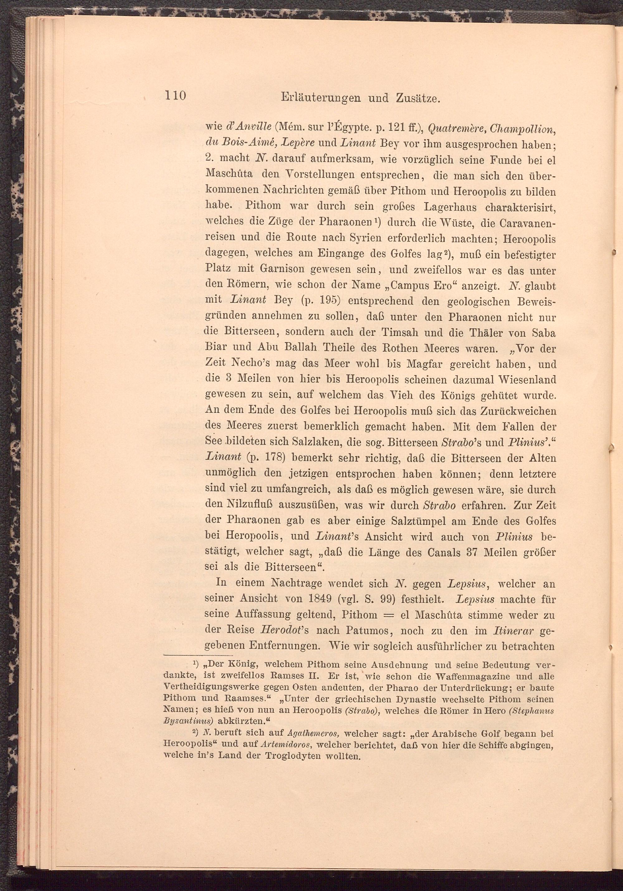 Platz mit Garnison gewesen sein, und zweifellos war es das unter den Römern, wie schon der Name „Campus Ero“ anzeigt. N. glaubt mit Linant Bey (p. 195) entsprechend den geologischen Beweisgründen annehmen zu sollen, daß unter den Pharaonen nicht nur die Bitterseen, sondern auch der Timsah und die Thäler von Saba Biar und Abu Ballah Theile des Rothen Meeres waren. „Vor der Zeit Neeho’s mag das Meer wohl bis Magfar gereicht haben, und die 3 Meilen von hier bis Heroopolis scheinen dazumal Wiesenland gewesen zu sein, auf welchem das Vieh des Königs gehütet wurde.