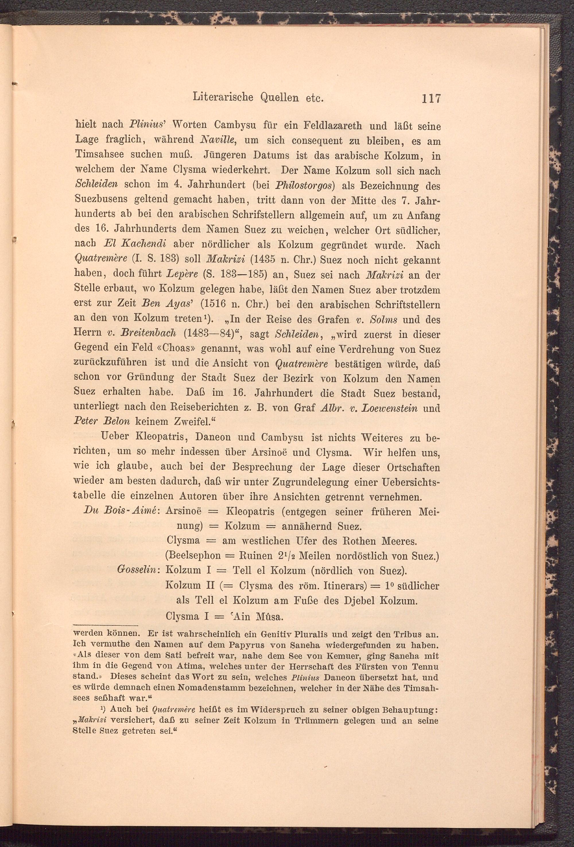 hielt nach Plinius’ Worten Cambysu für ein Feldlazareth und läßt seine Lage fraglich, während Naville, um sich conséquent zu bleiben, es am Timsahsee suchen muß. Jüngeren Datums ist das arabische Kolzum, in welchem der Name Clysma wiederkehrt. Der Name Kolzum soll sich nach Schleiden schon im 4. Jahrhundert (hei Philostor gos ) als Bezeichnung des Suezbusens geltend gemacht haben, tritt dann von der Mitte des 7. Jahrhunderts ab hei den arabischen Schrifstellern allgemein auf, um zu Anfang des 16. Jahrhunderts dem Namen Suez zu weichen, welcher Ort südlicher, nach El Kachendi aber nördlicher als Kolzum gegründet wurde. Nach Quatremere (I. S. 188) soll Makrizi (1435 n. Chr.) Suez noch nicht gekannt haben, doch führt Lepère (S. 183—185) an, Suez sei nach Makrizi an der Stelle erbaut, wo Kolzum gelegen habe, läßt den Namen Suez aber trotzdem erst zur Zeit Ben Ayas ’ (1516 n. Chr.) bei den arabischen Schriftstellern an den von Kolzum treten 1 ). „In der Heise des Grafen v. Solms und des Herrn v. Breitenbach (1483—84)“, sagt Schleiden , „wird zuerst in dieser Gegend ein Feld «Choas» genannt, was wohl auf eine Verdrehung von Suez zurückzuführen ist und die Ansicht von Quatremere bestätigen würde, daß schon vor Gründung der Stadt Suez der Bezirk von Kolzum den Namen Suez erhalten habe. Daß im 16. Jahrhundert die Stadt Suez bestand, unterliegt nach den Reiseberichten z. B. von Graf Älbr. v. Loeicenstein und Peter Beton keinem Zweifel.“