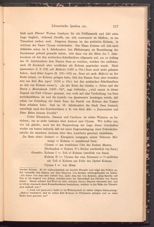 P Auch hei Quatremère heißt es im Widerspruch zu seiner obigen Behauptung: „Makrizi versichert, daß zu seiner Zeit Kolzum in Trümmern gelegen und an seine Stelle Suez getreten sei.“