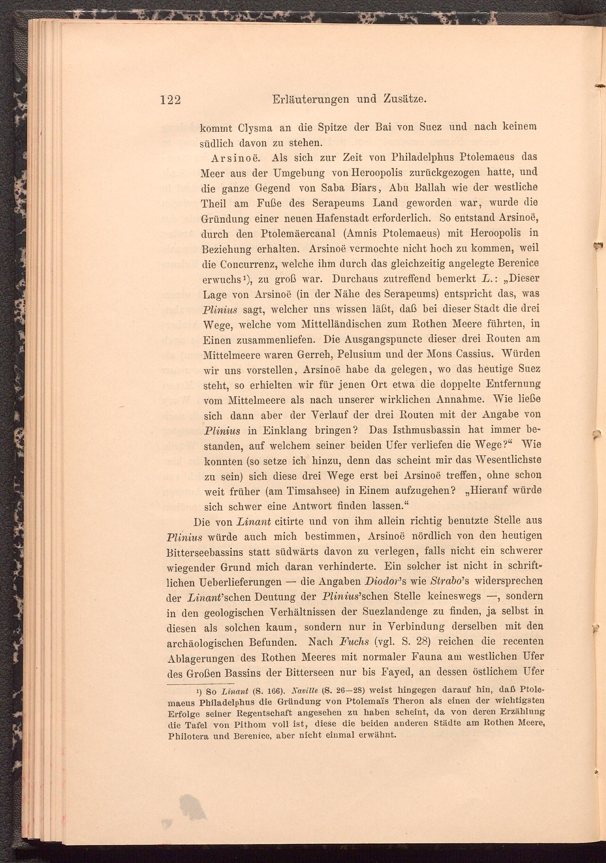 Die von Linant citirte und von ihm allein richtig benutzte Stelle aus Plinius würde auch mich bestimmen, Arsinoe nördlich von den heutigen Bitterseebassins statt südwärts davon zu verlegen, falls nicht ein schwerer wiegender Grund mich daran verhinderte. Ein solcher ist nicht in schriftlichen Ueberlieferungen — die Angaben Diodor’ s wie Strabo’ s widersprechen der Linant’sehen Deutung der Plinius’sehen Stelle keineswegs —, sondern in den geologischen Verhältnissen der Suezlandenge zu finden, ja selbst in diesen als solchen kaum, sondern nur in Verbindung derselben mit den archäologischen Befunden. Nach Fuchs (vgl. S. 28) reichen die recenten Ablagerungen des Rothen Meeres mit normaler Fauna am westlichen Ufer des Großen Bassins der Bitterseen nur bis Fayed, an dessen östlichem Ufer