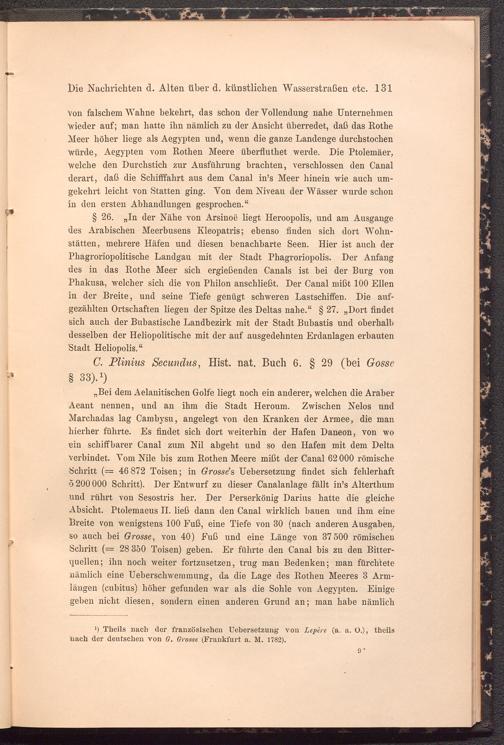 „Bei dem Aelanitischen Golfe liegt noch ein anderer, welchen die Araber Aeant nennen, und an ihm die Stadt Heroum. Zwischen Nelos und Marehadas lag Cambysu, angelegt von den Kranken der Armee, die man hierher führte. Es findet sich dort weiterhin der Hafen Daneon, von wo ein schiffbarer Canal zum Nil abgeht und so den Hafen mit dem Delta verbindet. Vom Nile bis zum Rothen Meere mißt der Canal 62000 römische Schritt (= 46 872 Toisen; in Grosse 's Uebersetzung findet sich fehlerhaft o 200 000 Schritt). Der Entwurf zu dieser Canalanlage fällt in’s Alterthum und rührt von Sesostris her. Der Perserkönig Darius hatte die gleiche Absicht. Ptolemaeus II. ließ dann den Canal wirklich bauen und ihm eine Breite von wenigstens 100 Fuß, eine Tiefe von 30 (nach anderen Ausgaben, so auch bei Grosse , von 40) Fuß und eine Länge von 37 500 römischen Schritt (= 28 350 Toisen) geben. Er führte den Canal bis zu den Bitterquellen; ihn noch weiter fortzusetzen, trug man Bedenken; man fürchtete nämlich eine Ueberschwemmung, da die Lage des Rothen Meeres 3 Armlängen (cubitus) höher gefunden war als die Sohle von Aegypten. Einige geben nicht diesen, sondern einen anderen Grund an; man habe nämlich