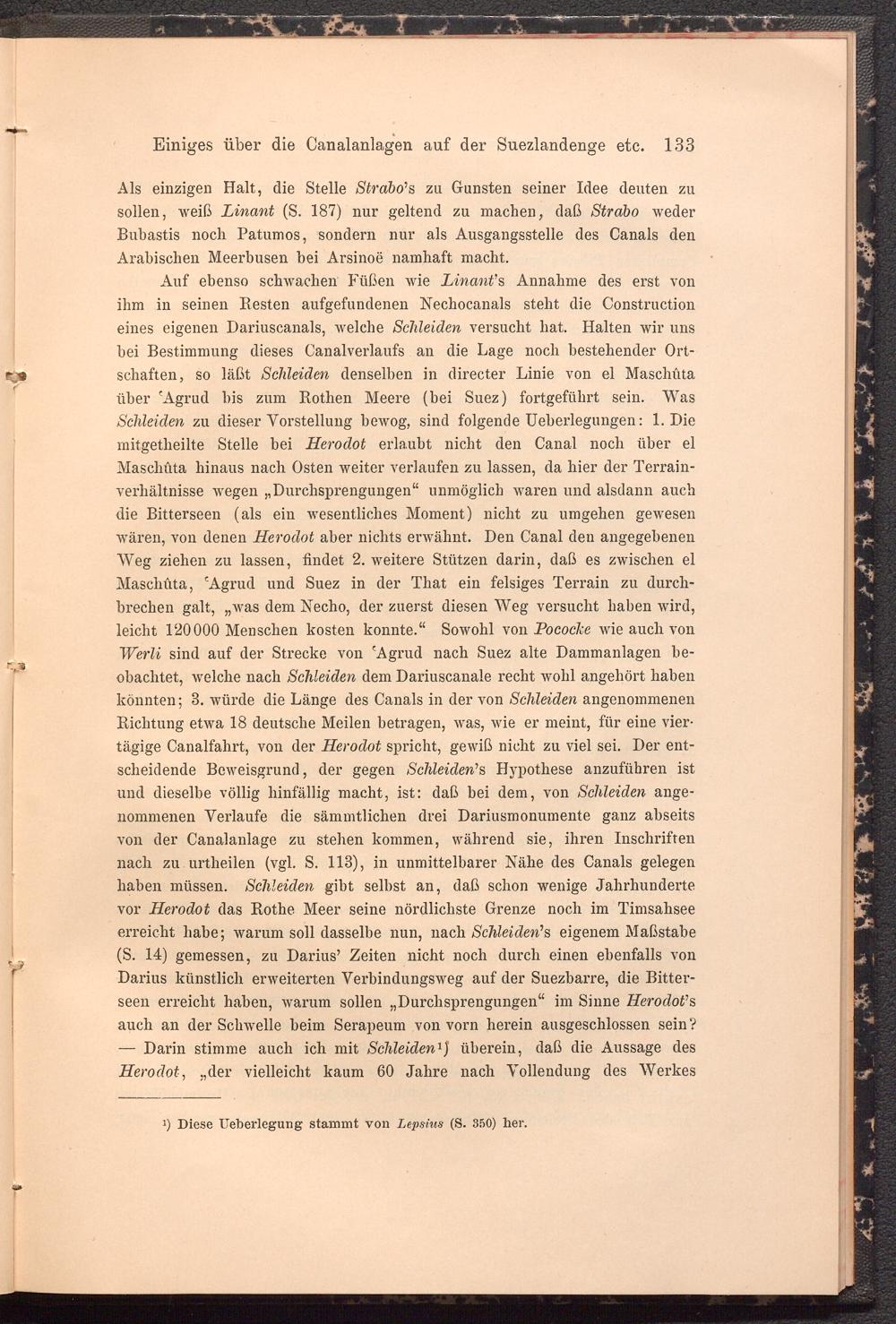 Auf ebenso schwachen Füßen wie Linant' s Annahme des erst von ihm in seinen Resten aufgefundenen Nechocanals steht die Construction eines eigenen Dariuscanals, welche Schleiden versucht hat. Halten wir uns bei Bestimmung dieses Canalverlaufs an die Lage noch bestehender Ortschaften, so läßt Schleiden denselben in directer Linie von el Maschüta über 'Agrud bis zum Rothen Meere (bei Suez) fortgeführt sein. Was Schleiden zu dieser Vorstellung bewog, sind folgende Ueberlegungen: 1. Die mitgetheilte Stelle bei Herodot erlaubt nicht den Canal noch über el Maschüta hinaus nach Osten weiter verlaufen zu lassen, da hier der Terrainverhältnisse wegen „Durchsprengungen“ unmöglich waren und alsdann auch die Bitterseen (als ein wesentliches Moment) nicht zu umgehen gewesen wären, von denen Herodot aber nichts erwähnt. Den Canal den angegebenen Weg ziehen zu lassen, findet 2. weitere Stützen darin, daß es zwischen el Maschüta, 'Agrud und Suez in der That ein felsiges Terrain zu durchbrechen galt, „was dem Necho, der zuerst diesen Weg versucht haben wird, leicht 120000 Menschen kosten konnte.“ Sowohl von Pococke wie auch von Werli sind auf der Strecke von 'Agrud nach Suez alte Dammanlagen beobachtet, welche nach Schleiden dem Dariuscanale recht wohl angehört haben könnten; 3. würde die Länge des Canals in der von Schleiden angenommenen Richtung etwa 18 deutsche Meilen betragen, was, wie er meint, für eine viertägige Canalfahrt, von der Herodot spricht, gewiß nicht zu viel sei. Der entscheidende Beweisgrund, der gegen Schleiden 1 s Hypothese anzuführen ist und dieselbe völlig hinfällig macht, ist: daß bei dem, von Schleiden angenommenen Verlaufe die sämmtlichen drei Dariusmonumente ganz abseits von der Canalanlage zu stehen kommen, während sie, ihren Inschriften nach zu urtheilen (vgl. S. 113), in unmittelbarer Nähe des Canals gelegen haben müssen. Schleiden gibt selbst an, daß schon wenige Jahrhunderte vor Herodot das Rothe Meer seine nördlichste Grenze noch im Timsahsee erreicht habe; warum soll dasselbe nun, nach Schleiden’?, eigenem Maßstabe (S. 14) gemessen, zu Darius’ Zeiten nicht noch durch einen ebenfalls von Darius künstlich erweiterten Verbindungsweg auf der Suezbarre, die Bitterseen erreicht haben, warum sollen „Durchsprengungen“ im Sinne Herodot' s auch an der Schwelle beim Serapeum von vorn herein ausgeschlossen sein? — Darin stimme auch ich mit Schleiden 1 ) überein, daß die Aussage des Herodot , „der vielleicht kaum 60 Jahre nach Vollendung des Werkes