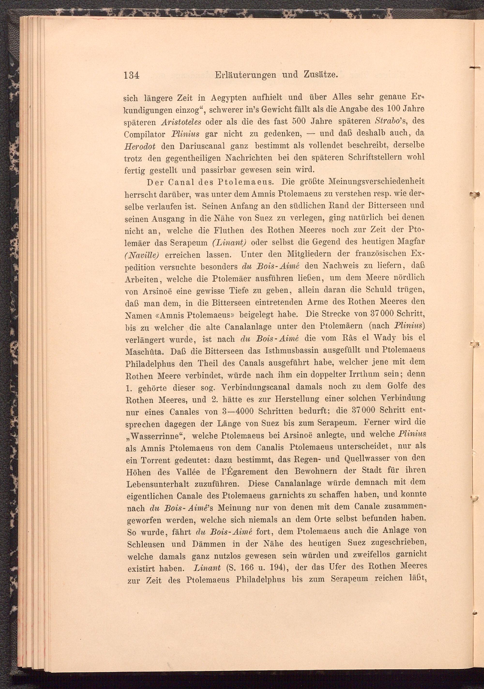 sich längere Zeit in Aegypten aufhielt und über Alles sehr genaue Er« kundigungen einzog“, schwerer in’s Gewicht fällt als die Angabe des 100 Jahre späteren Aristoteles oder als die des fast 500 Jahre späteren Strabo’s, des Compilator Plinius gar nicht zu gedenken, — und daß deshalb auch, da Herodot den Dariuscanal ganz bestimmt als vollendet beschreibt, derselbe trotz den gegentheiligen Nachrichten hei den späteren Schriftstellern wohl fertig gestellt und passirbar gewesen sein wird.