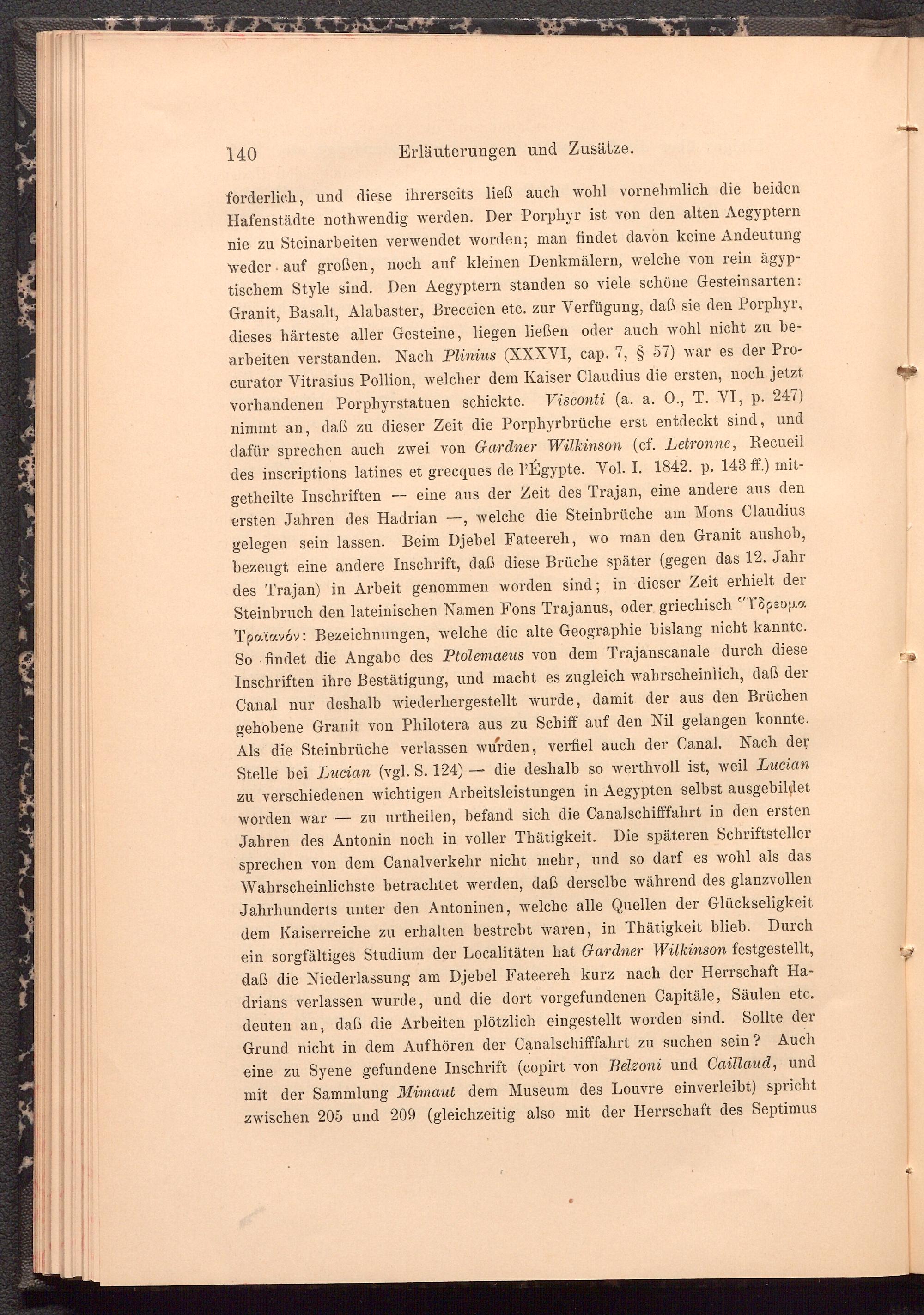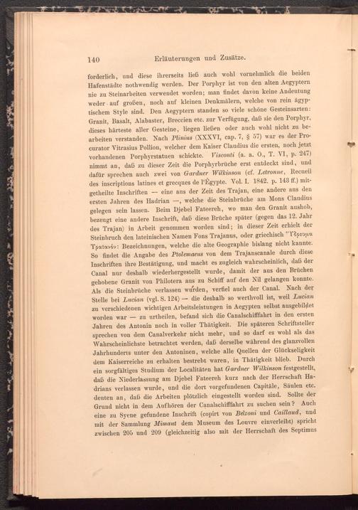 forderlich, und diese ihrerseits ließ auch wohl vornehmlich die beiden Hafenstädte nothwendig werden. Der Porphyr ist von den alten Aegyptern nie zu Steinarbeiten verwendet worden; man findet davon keine Andeutung weder auf großen, noch auf kleinen Denkmälern, welche von rein ägyptischem Style sind. Den Aegyptern standen so viele schöne Gesteinsarten: Granit, Basalt, Alabaster, Breccien etc. zur Verfügung, daß sie den Porphyr, dieses härteste aller Gesteine, liegen ließen oder auch w T ohl nicht zu bearbeiten verstanden. Nach Plinius (XXXVI, cap. 7, § 57) war es der Pro- curator Vitrasius Pollion, welcher dem Kaiser Claudius die ersten, noch jetzt vorhandenen Porphyrstatuen schickte. Visconti (a. a. 0., T. VI, p. 247) nimmt an, daß zu dieser Zeit die Porphyrbrüche erst entdeckt sind, und dafür sprechen auch zwei von Gardner Wükinson (cf. Lctronne, Recueil des inscriptions latines et grecques de l’Egypte. Vol. I. 1842. p. 143 ff.) mit- getheilte Inschriften — eine aus der Zeit des Trajan, eine andere aus den ersten Jahren des Hadrian —, welche die Steinbrüche am Mons Claudius gelegen sein lassen. Beim Djebel Fateereh, wo man den Granit aushob, bezeugt eine andere Inschrift, daß diese Brüche später (gegen das 12. Jahr des Trajan) in Arbeit genommen worden sind; in dieser Zeit ei'hielt der Steinbruch den lateinischen Namen Fons Trajanus, oder griechisch 'T§psopa Tpoüavov: Bezeichnungen, welche die alte Geographie bislang nicht kannte. So findet die Angabe des Ptolemaeus von dem Trajanscanale durch diese Inschriften ihre Bestätigung, und macht es zugleich -wahrscheinlich, daß der Canal nur deshalb wiederhergestellt wurde, damit der aus den Brüchen gehobene Granit von Philotera aus zu Schiff auf den Nil gelangen konnte. Als die Steinbrüche verlassen wurden, verfiel auch der Canal. Nach der Stelle bei Lucian (vgl. S. 124) — die deshalb so werthvoll ist, weil Lucian zu verschiedenen wichtigen Arbeitsleistungen in Aegypten selbst ausgebildet worden war — zu urtheilen, befand sich die Canalschifffahrt in den ersten Jahren des Antonin noch in voller Thätigkeit. Die späteren Schriftsteller sprechen von dem Canalverkehr nicht mehr, und so darf es wohl als das Wahrscheinlichste betrachtet werden, daß derselbe während des glanzvollen Jahrhunderts unter den Antoninen, welche alle Quellen der Glückseligkeit dem Kaiserreiche zu erhalten bestrebt waren, in Thätigkeit blieb. Durch ein sorgfältiges Studium der Localitäten hat Gardner Wükinson festgestellt, daß die Niederlassung am Djebel Fateereh kurz nach der Herrschaft Hadrians verlassen wurde, und die dort Vorgefundenen Capitäle, Säulen etc. deuten an, daß die Arbeiten plötzlich eingestellt worden sind. Sollte der Grund nicht in dem Aufhören der Canalschifffahrt zu suchen sein ? Auch eine zu Syene gefundene Inschrift (copirt von Belzoni und Caülaud , und mit der Sammlung Mimaut dem Museum des Louvre einverleibt) spricht zwischen 205 und 209 (gleichzeitig also mit der Herrschaft des Septimus